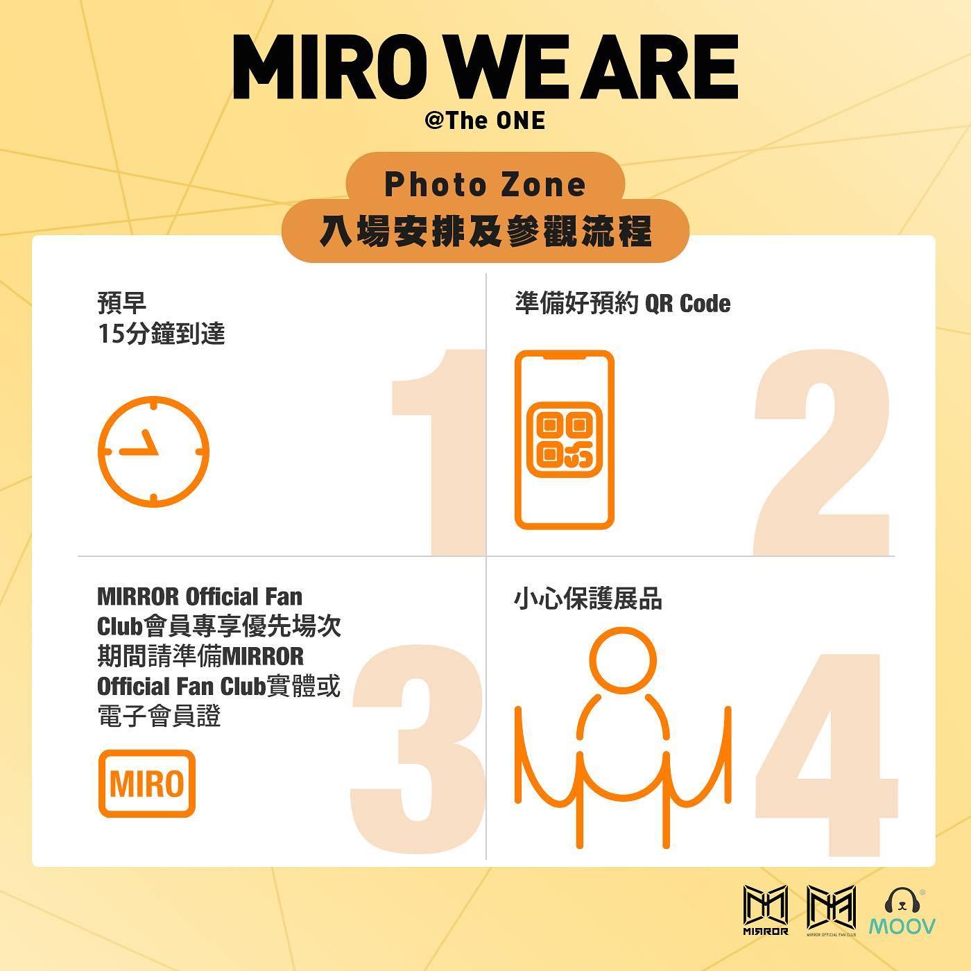 725日起,尖沙咀The ONE將變成專為MIRO而設的【MIRO WE ARE】,分成3個區域。The ONE UG2中庭為MIRROR Official Fan Club會員專門而設的MIRO WE ARE Photo Zone,將設置12子人型展覽擺設打卡位,還有巨型MIRO WE ARE」字母,讓MIRO一起打卡及為MIRROR打氣,留下美好的回憶!