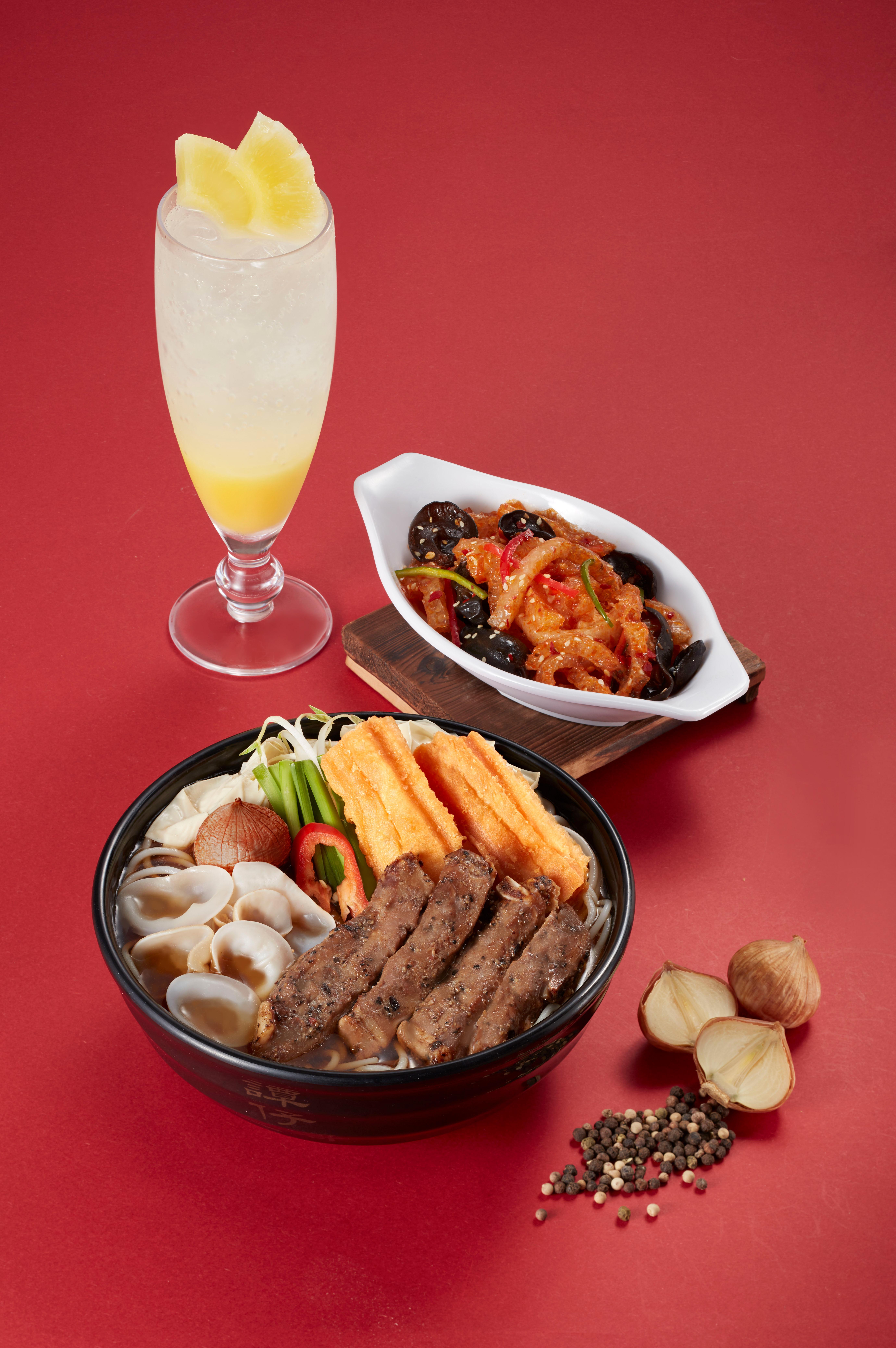 煳辣肉骨湯米線配黑胡椒豬扒條、清爽脆豬皮及鳳梨乳酸梳打。
