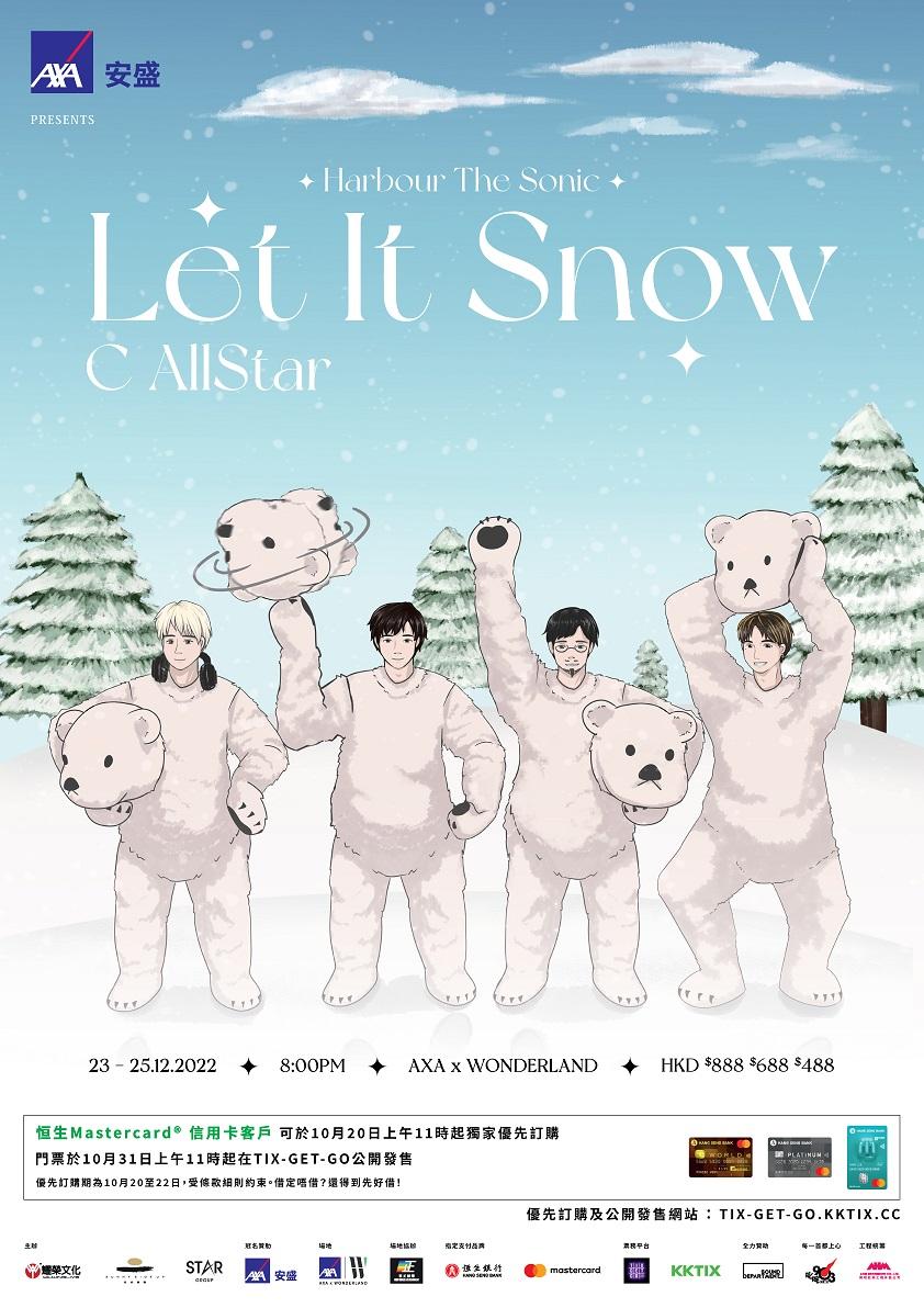 每年聖誕於街頭快閃報佳音,幾乎是C AllStar每年與歌迷之約。相隔數年,C AllStar今年將舞台由街頭移師大型戶外場地「找數」,將於12月23至25日在西九文化區竹翠公園舉行「Let it snow」音樂會,以C AllStar定義的冬日經歷,兌現與歌迷歡度聖誕的承諾。音樂會門票將於本月20至22日優先訂購,31日早上11時公開發售。