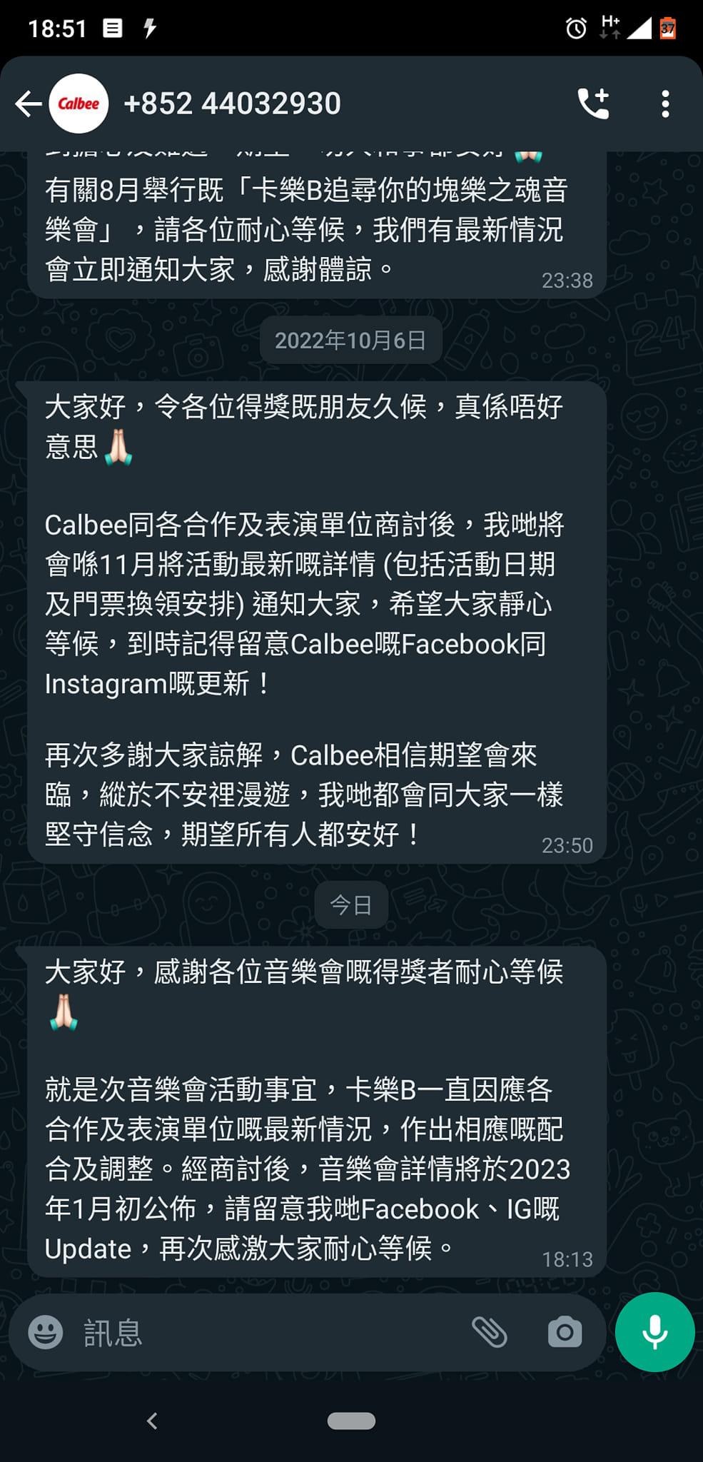 來到11月最後一日,卡樂B今日向持有門票的人士發短訊通知,指他們一直因應各合作及表演的最新情況,作出相應配合及調整。經商討之後,音樂會詳情將於明年1月初公佈,並感激大家耐心等候。有網民表示,希望1月會迎來So Ching的好消息,亦有人預計屆時或許換COLLAR其他成員代替So Ching演出。