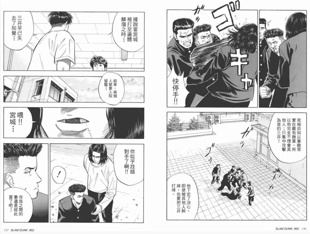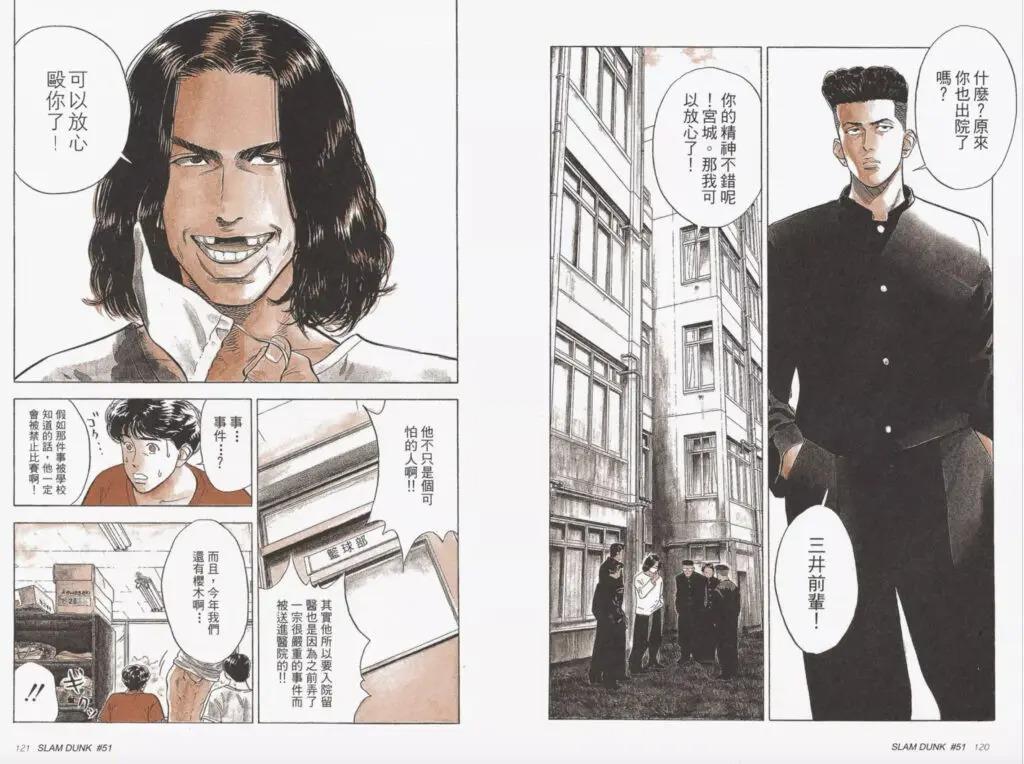 《Slam Dunk》漫畫中提及,宮城良田跟三井壽打架後,便雙雙入住醫院。但在電影版《The First Slam Dunk》中透露,他跟三井壽打架後,去了騎電單車,遇上車禍而入院。(《Slam Dunk》漫畫截圖)
