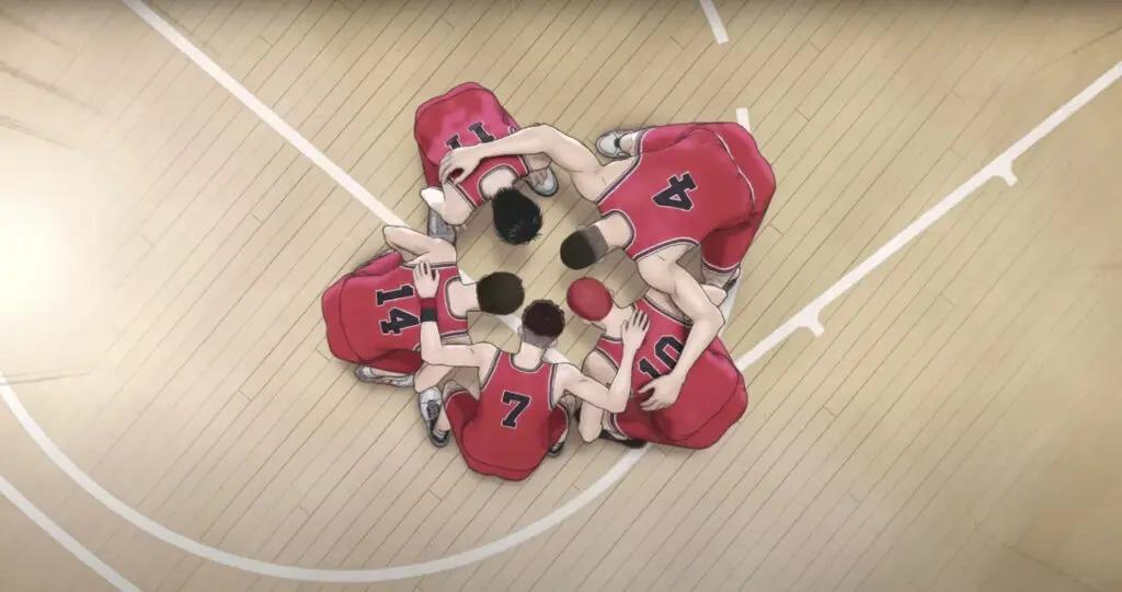 「山王之戰」的末段,赤木剛憲讓宮城良田來帶領喊口號,對應漫畫裡邊,赤木剛憲離開球隊後,由宮城良田擔任湘北隊的隊長一事。(《The First Slam Dunk》預告片截圖)