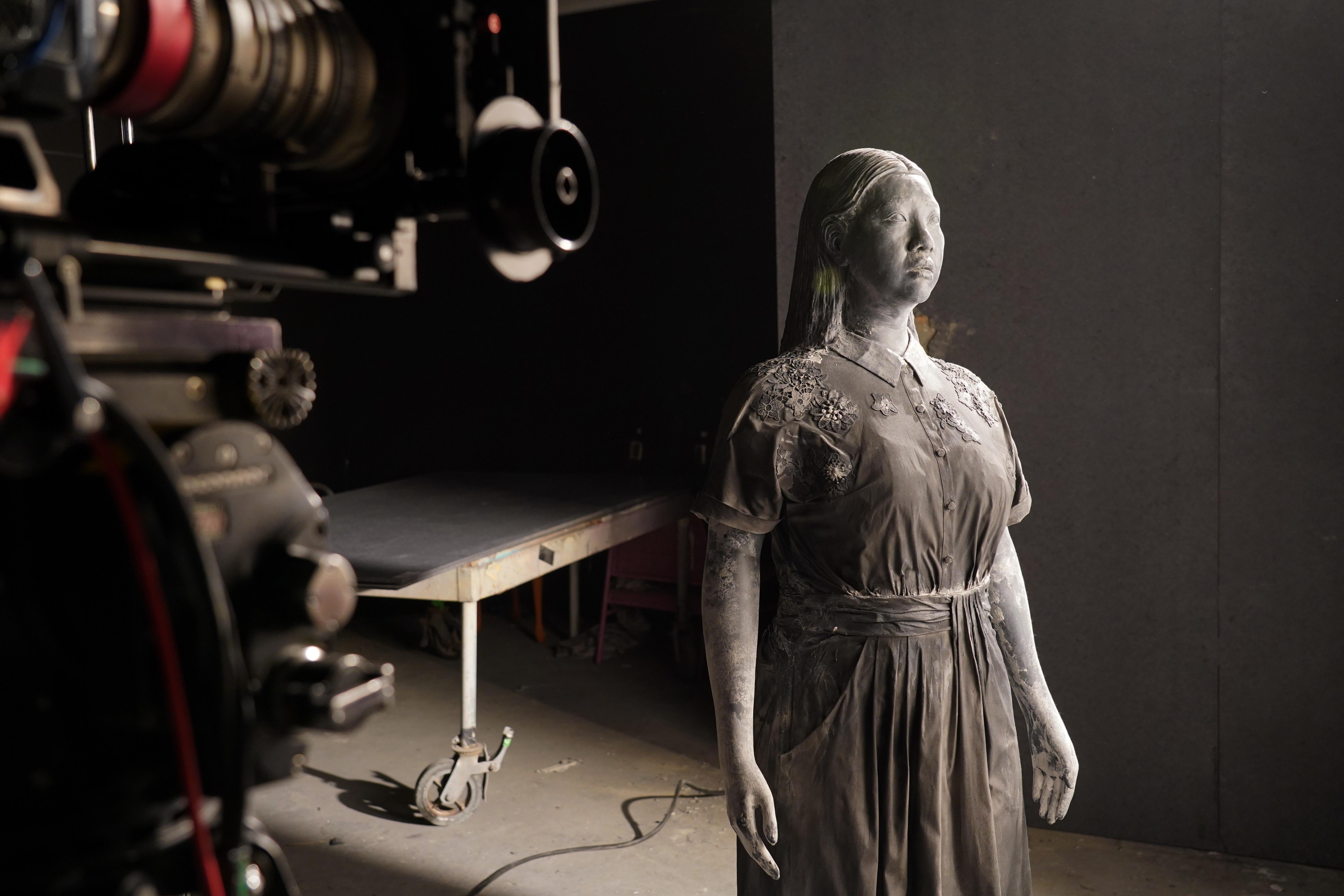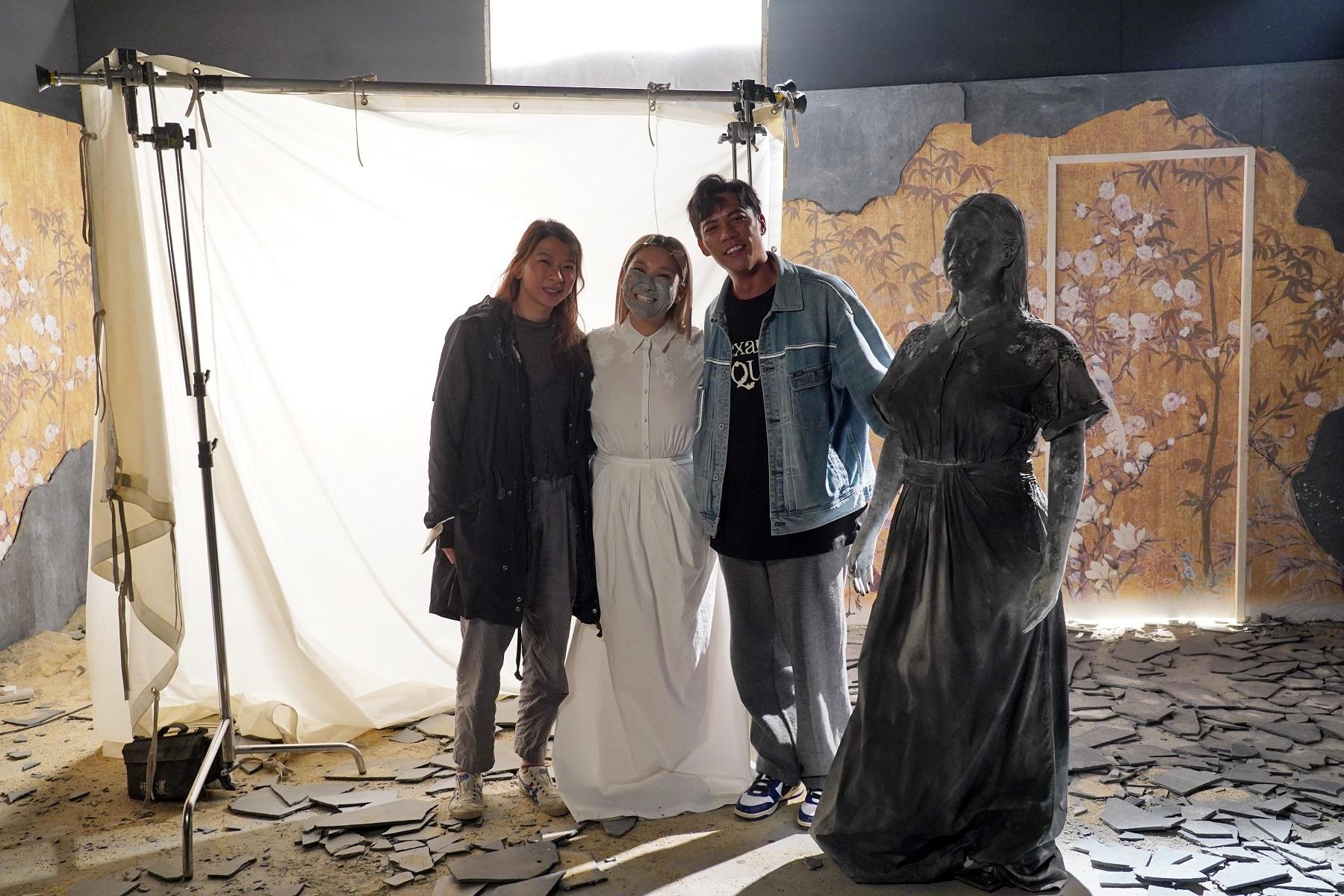 欣宜與MV導演張蚊、男主角張文傑和石像合照留念。