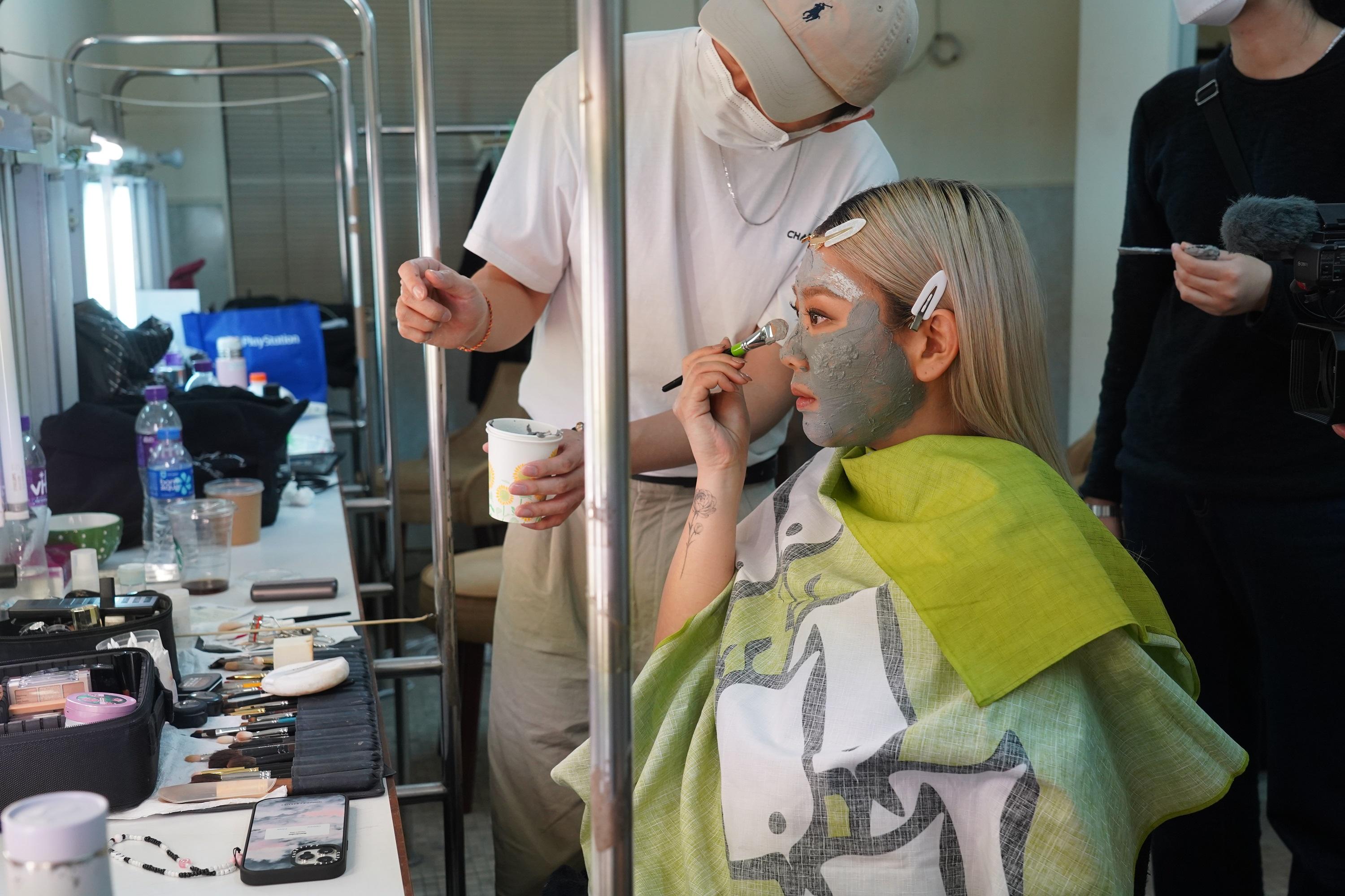 欣宜面上要化上仿灰泥的化妝品。