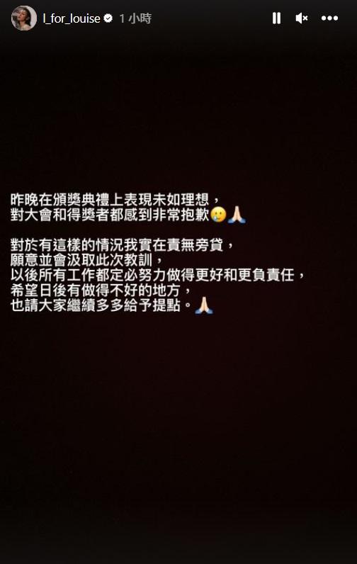 王丹妮的表現令不少人失望,今日她在社交平台限時動態就事件致歉,她說︰「昨晚在頒獎典禮上表現未如理想,對大會和得獎者都感到非常抱歉。對於有這樣的情況,我實在責無旁貸,願意並會汲取此次教訓,以後所有工作都定必努力做得更好和更負責任,希望日後有做得不好的地方,也請大家繼續多多給予提點。」