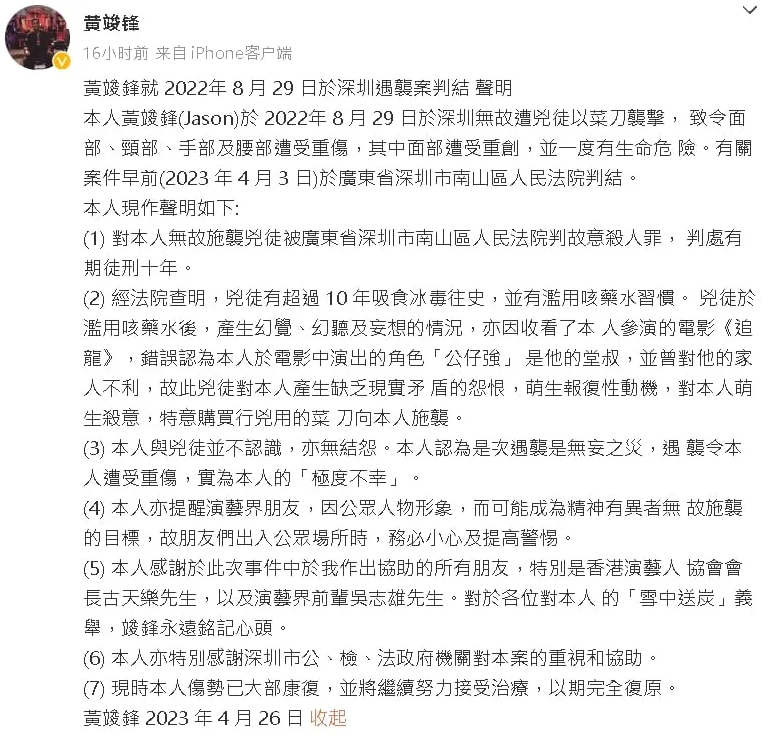 黃竣鋒26日在微博發出聲明,透露兇徒因濫用藥物出現妄想而斬錯人。(圖/翻攝自黃竣鋒微博)
