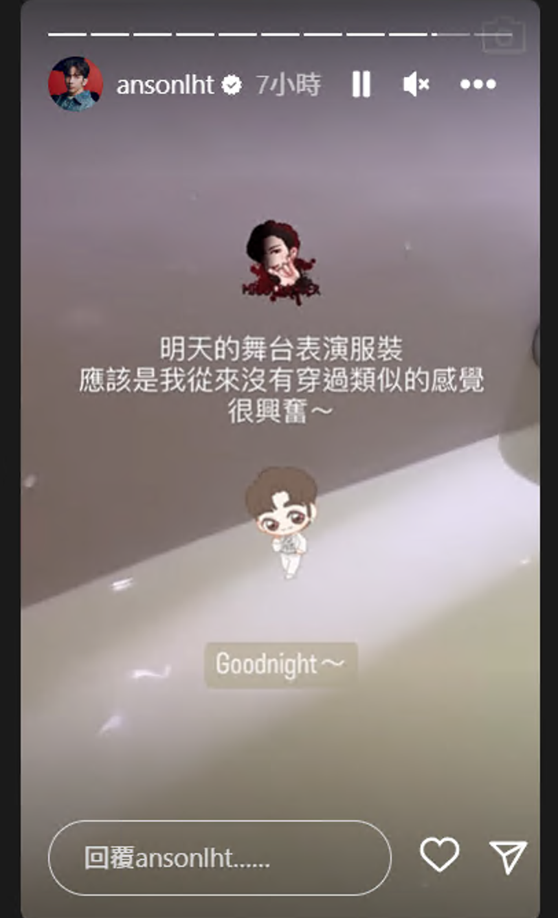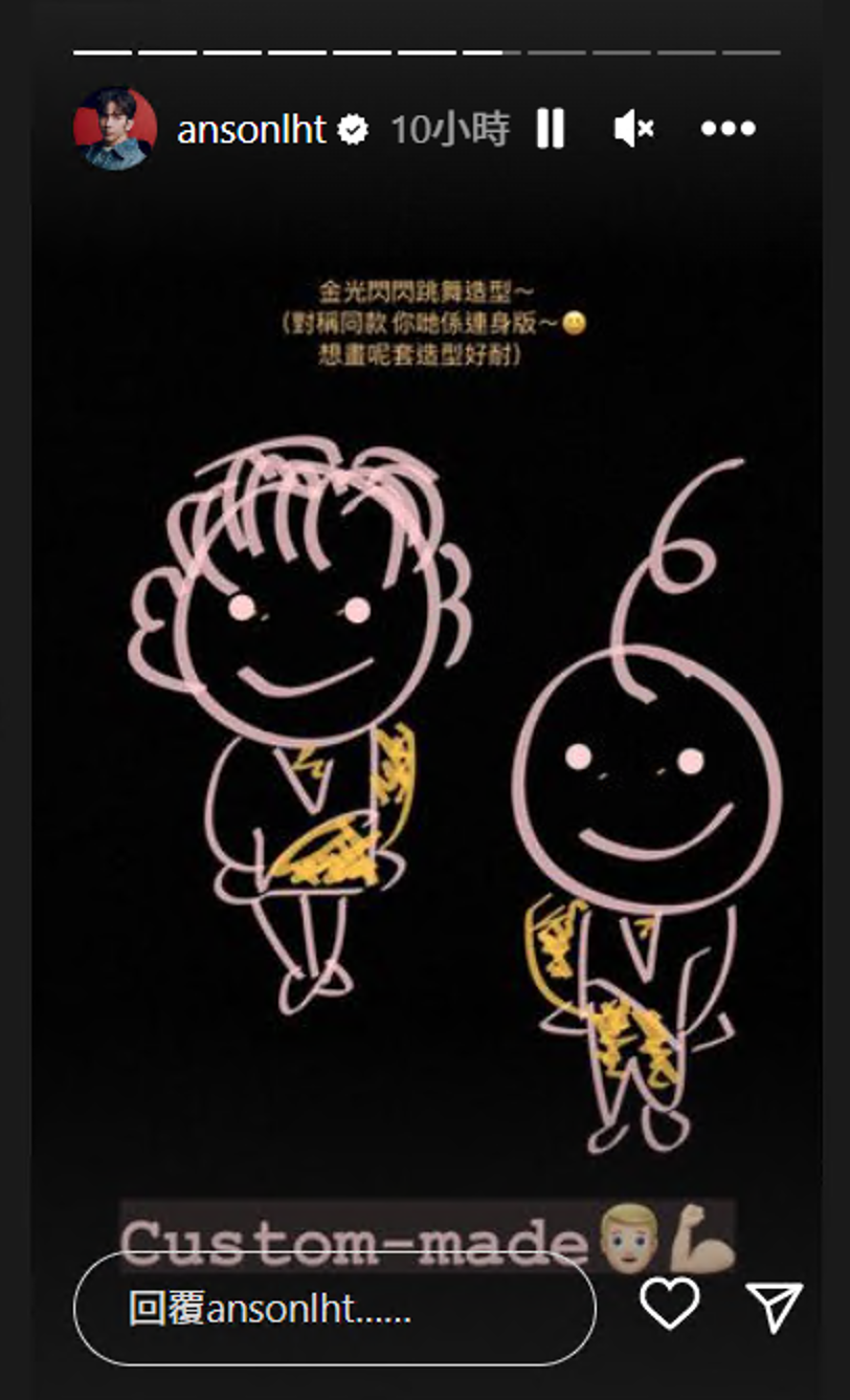 Anson Lo則在IG限時動態透露今日會以全新造型登場,而且衣服是金光閃閃。由於 他拍《12怪盜》一場打鬥戲時發生意外,導致下腰連右腳韌帶的膝蓋受傷,為了應付今日演出,他除了拉筋之外,更貼上大量鎮痛貼以舒緩腳部情況。