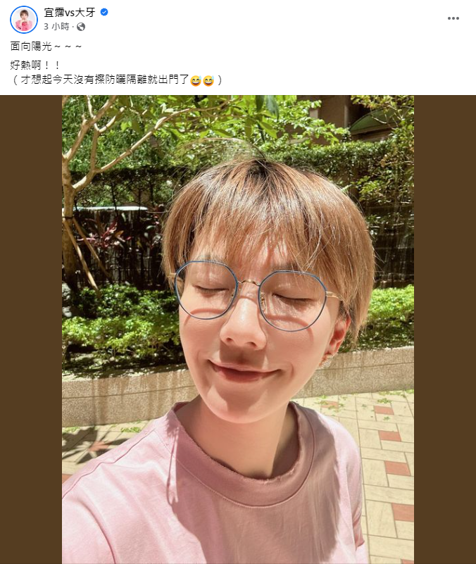 大牙7日在臉書分享戴着眼鏡外出曬太陽的自拍照,表示「面向陽光~~~好熱啊!!」,接着坦言:「才想起今天沒有擦防曬、隔離就出門了。」並在留言區回應網友們的關心,補充當天的天氣非常炎熱:「這是綠島的溫度吧」、「方向盤直接風火輪欸」、「真的是熱到快乾枯的溫度耶」。對此,許多粉絲則留言送上鼓勵,表示:「面向陽光遠離妖魔鬼怪,加油」、「大牙加油!大家都在妳身邊,妳不孤單」、「大家都是妳的太陽」。