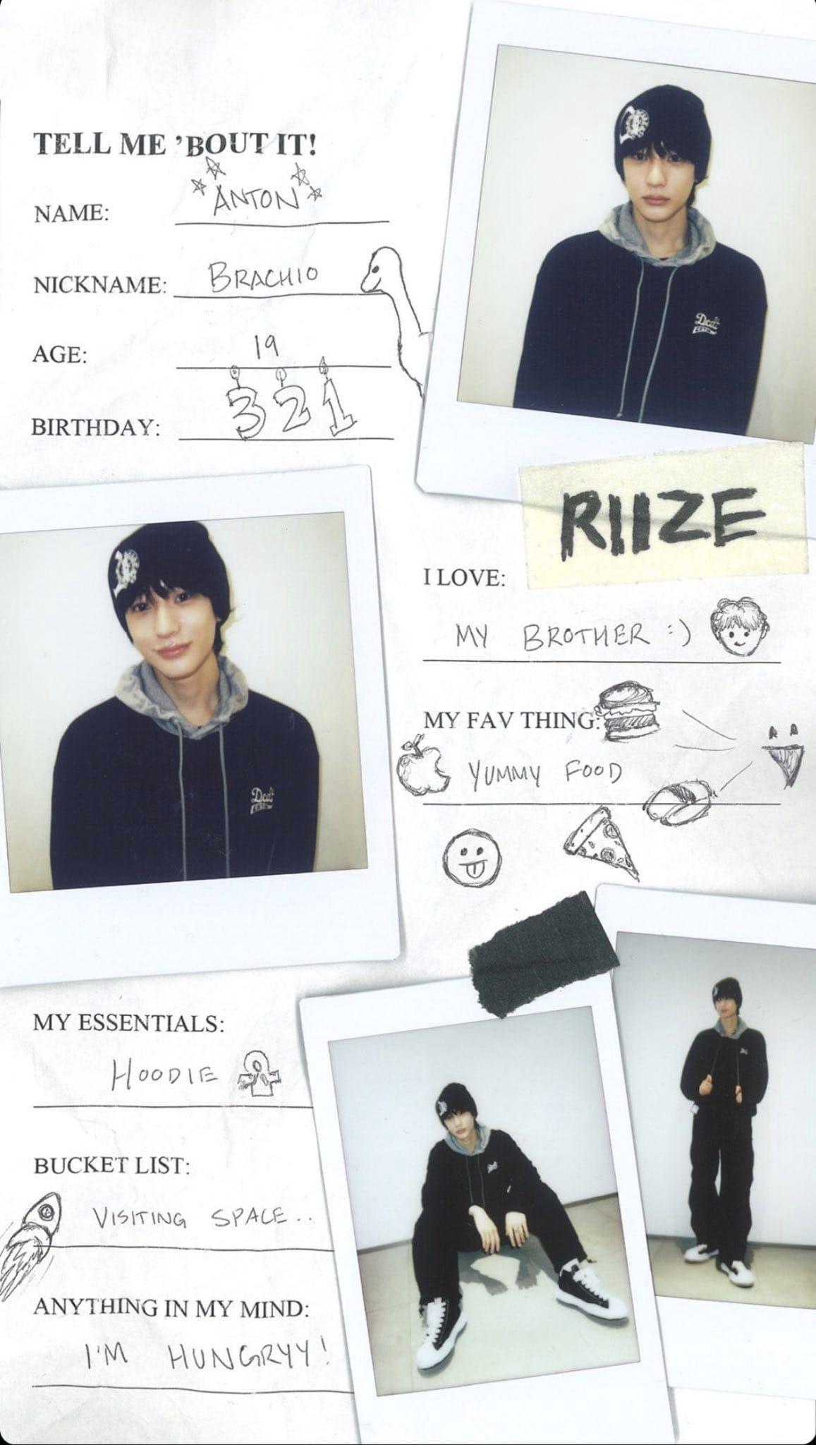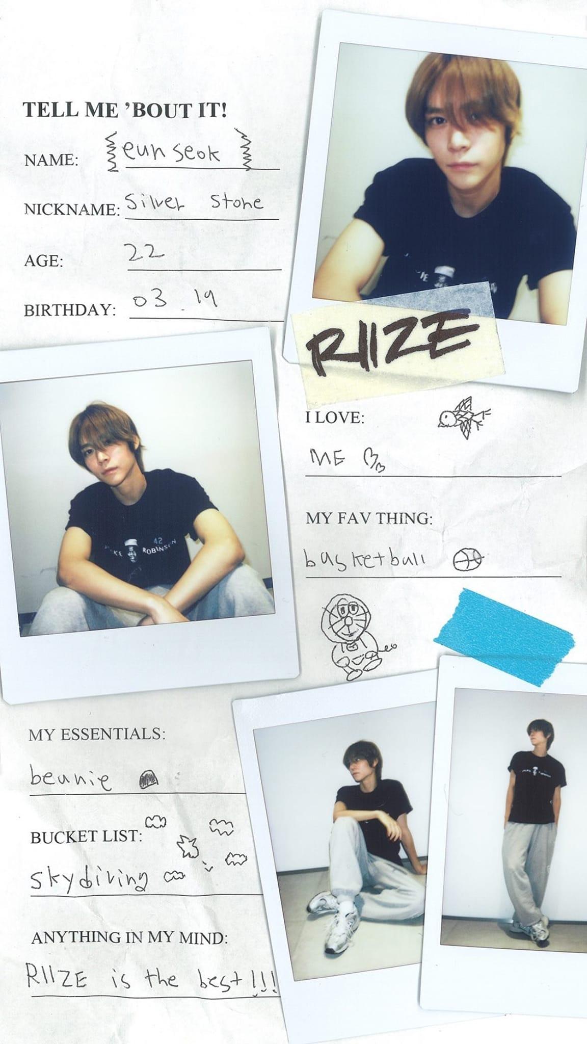 RIIZE由7名成員組成,分別是將太郎(Shotaro)、銀皙(Eunseok)、成燦(Sungchan)、沅彬(Wonbin)、昇瀚(Seunghan)、紹熙(Sohee)和Anton(璨榮)組成。他們每位成員都擁有各自的特長和才華,共同建立起這個名為RIIZE的團體,一同開展他們的音樂之旅。而團名RIIZE的來原,就是將「成長」(Rise)和「實現」(Realize)這兩個詞結合,名字的寓意成員們一起成長,實現夢想的團隊,並通過音樂來表達各種情感和價值觀。