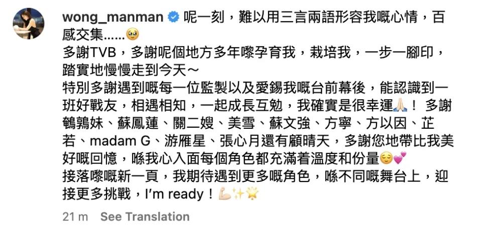 繼早前效力TVB 30年嘅吳家樂宣布離巢後,今日(12月1日)又再多一位TVB藝人宣布離巢,佢就係效力TVB16年嘅黃智雯(Mandy)。佢喺社交網站宣布離巢消息,獲得唔少網民同圈中好友祝福: