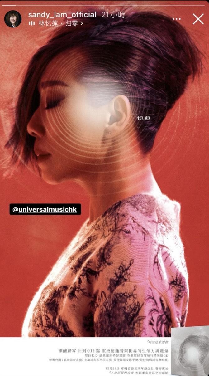 久未露面Sandy,2018年曾推出黑膠專輯《0》,翌年《0》於台灣金曲獎獲得7項提名,Sandy最終獲頒「最佳國語女歌手獎」與「最佳演唱錄音專輯獎」2個獎項。繼早前她一口氣在IG連發9則帖文表示:「好久不見,time flies It's me remember? #回憶總是溫柔的#我是林憶蓮不是始皇帝!」後,昨晨(14日)Sandy再在社交網貼出一張型爆側身照,並宣布下周四(21日)將推出《0》的精裝版CD,Sandy 在社交網留言表示︰「The CD version of "0" is coming to town﹗」而海報下亦寫着:「時空送來禮物。細釀歸零,回到《0》點,重啟憶蓮音樂世界的生命力與能量。堅持初心,誠意還原特製黑膠。」另有報道指,Sandy 亦計劃開演唱會,已經着手籌備。