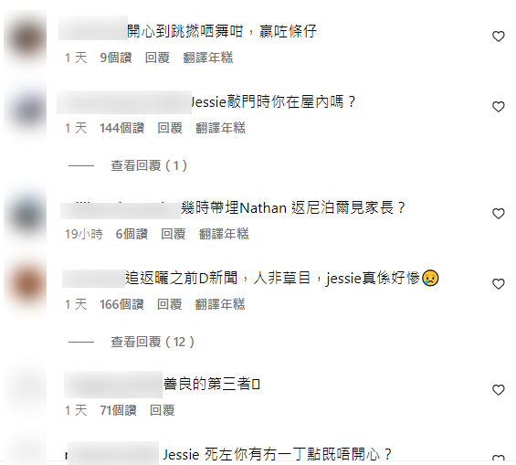 其後有網民列出時間線,質疑Day介入Nathan與圈外女友Jessie的關係。事件發酵多日,Day日前在TG粉絲群組回應︰「對不起讓喜歡我的大家擔心了,我會努力生活,專注工作,大家也要按時吃飯,繼續善良。」此外,她亦在IG貼上跟Gao及Candy的跳舞片段,當無事發生。