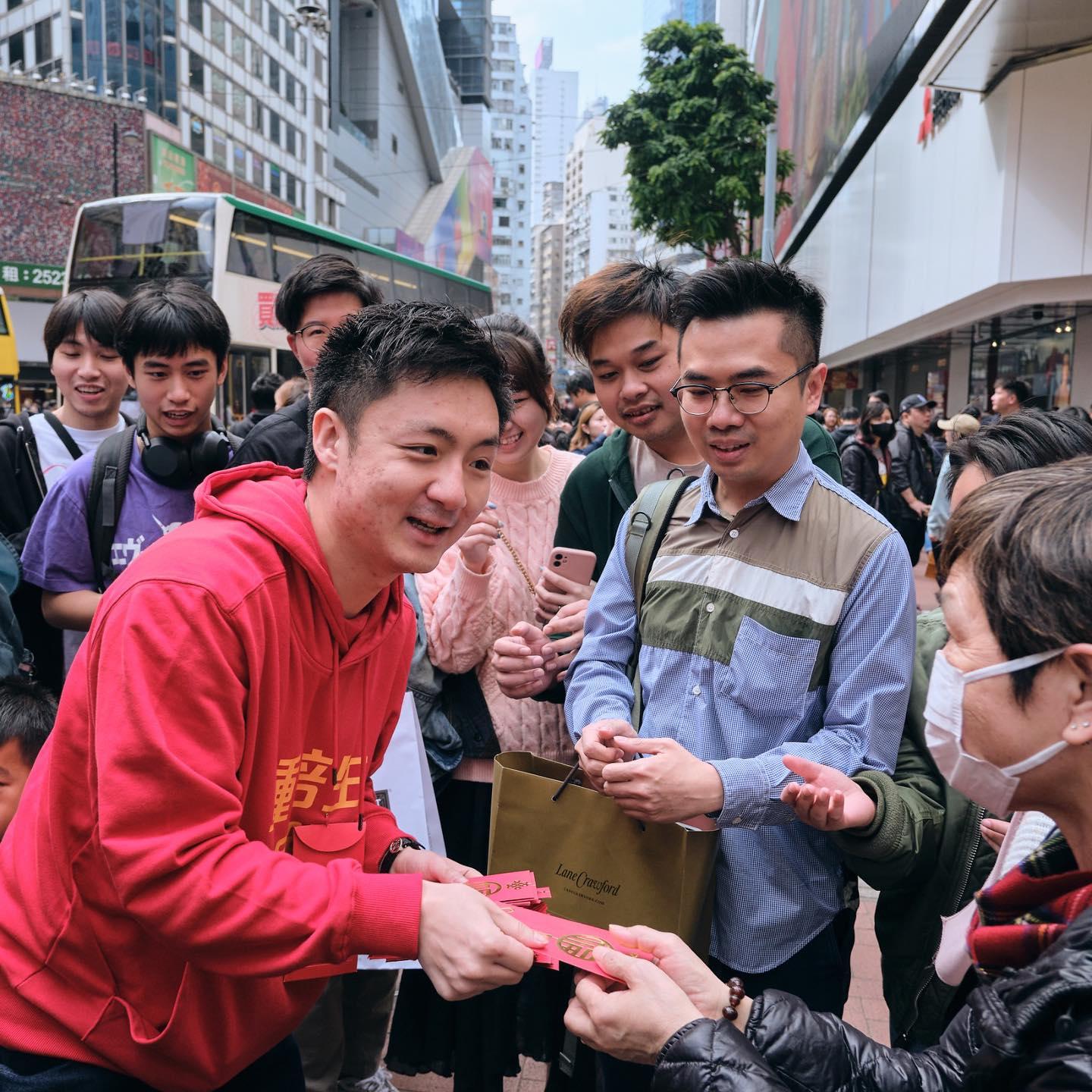 鍾培生在農曆年向途人大派100元利是。