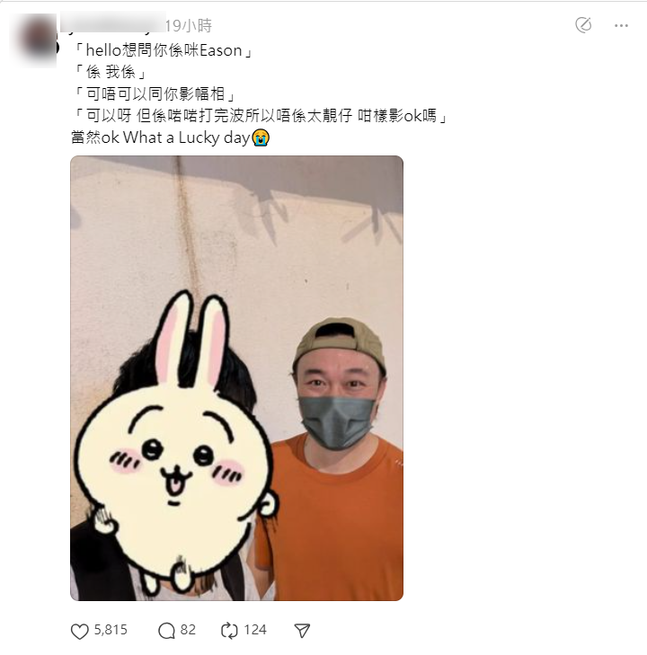 近日有網民上載跟Eason的合照,相中見到他戴上cap帽並穿上淨色tee,滿頭大汗的樣子。該名網民留言提到跟Eason相遇的情況,並問可否跟他合照,沒想到Eason竟然說可以,並謂「但係啱啱打完波所以唔係太靚仔 咁樣影ok?」有網民見狀大為羨慕,也有人提到自己過去曾求合照但被拒。網民稱當時過馬路撞到Eason,而且沒有太多人在街上,所以膽粗粗問可否合照。