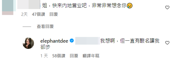 小S近日在IG發布廣告,湧進許多大陸粉絲留言,希望她能夠再到大陸發展,她12日也正面回應,坦承有意願「但一直有酸民(按:haters)讓我卻步」;而粉絲告訴她,有許多大陸網友在小紅書支持她,「看到越來越多人喜歡你們我真的很開心很感動,你和大S都是很好的人,時間會證明一切」。她也感動回應:「謝謝」。