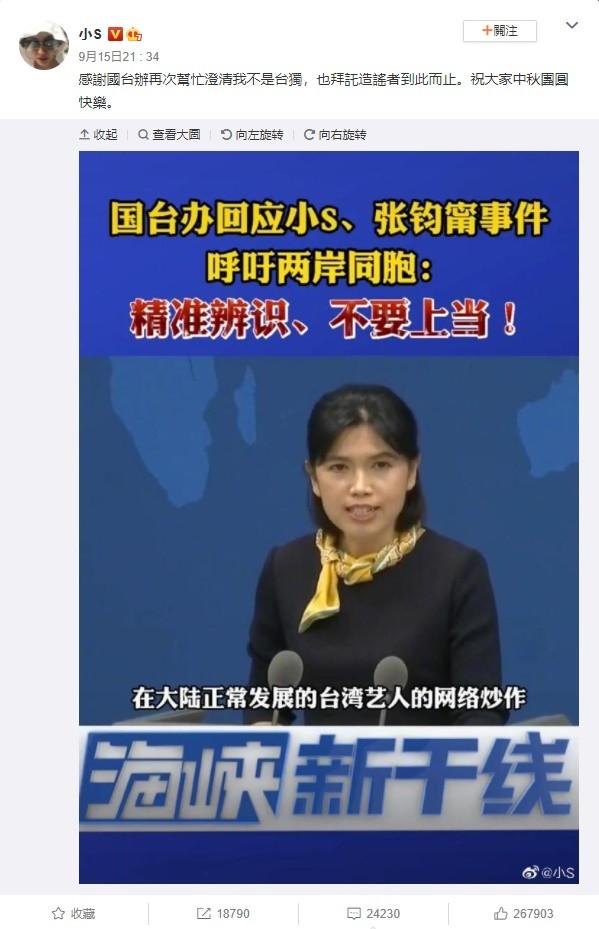 事實上,小S(徐熙娣)2021年東京奧運時,曾表示「為奧運國手應援」而遭大陸網友出征,當時她丟掉4項代言、損失數千萬元新台幣,她隨後也止血發文表示「我不是台獨!」,之後國台辦也發聲為她解圍,她也再度表示:「感謝國台辦再次幫忙澄清我不是台獨,也拜託造謠者到此而止。」