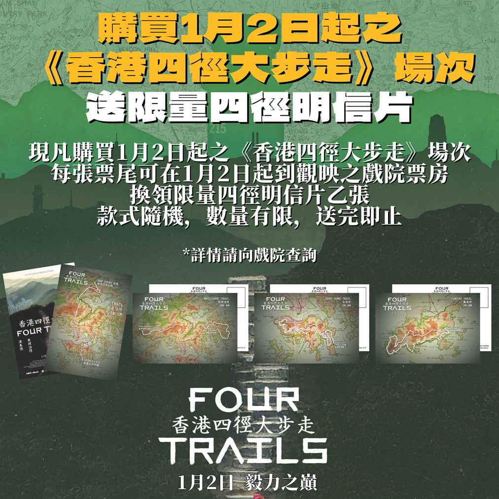 《香港四徑大步走》製作過程長達3年,其意義不只是紀錄各跑手的故事,亦是導演Robin送給香港的一封情書。配合電影於1月2日正式上映,導演特別剪輯了最新航拍預告,除了看到跑手在香港山徑間的堅持,更能以航拍鏡頭俯瞰神級四徑於不同時間及天氣下的美景,其壯麗程度絕對能媲美不少外國著名山嶺。為答謝觀眾的支持,凡購買1月2日起之《香港四徑大步走》場次,每張票尾可在1月2日起到觀映之戲院票房換領限量四徑明信片乙張。