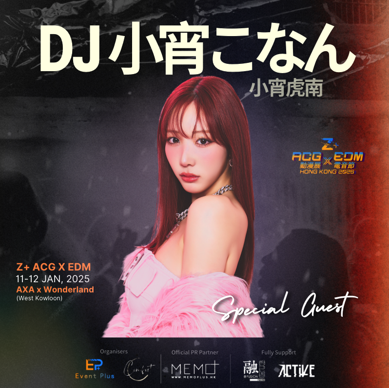 來自不同地方的超人氣DJ,計有亞洲電音寵兒DJ MAO,同樣由AV女優轉型打碟的小宵虎南,會是她首次以DJ Konan身份在港出席活動,而她自上月初首次來港舉行粉絲見面會後,相隔數星期再次襲港,而本月12日現身完「Z+ ACG x EDM HK 2025 動漫電音節」後,小宵虎南會在同月18日,到旺角西洋菜南街再辦個人見面會,傳出引退後集中火力進軍香港市場。