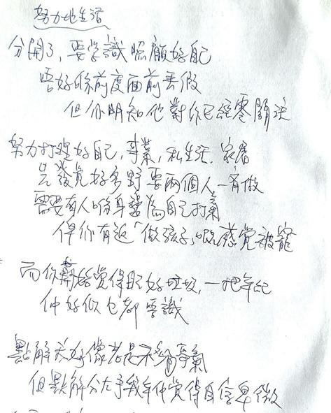 《努力地生活》由徐繼宗作曲,這位由入行已經認識的音樂人,正是陪藍奕邦走過療傷的重要見証人。藍奕邦指徐繼宗是「魚蛋歌」聖手,「佢嘅hookline好強,但唔俗氣,令人聽完會想去唱K。我正式同前度攤牌嗰晚,就係住喺徐繼宗溫哥華屋企,佢之後仲車我返前度舊屋企執返自己啲嘢。」藍奕邦亦是在他家的地庫寫下這首歌:「寫嚟寫去都寫唔到啱心水嘅副歌,我就叫徐繼宗幫我寫,冥冥中註定,呢首講我真實故事嘅歌,必須有佢參與。」