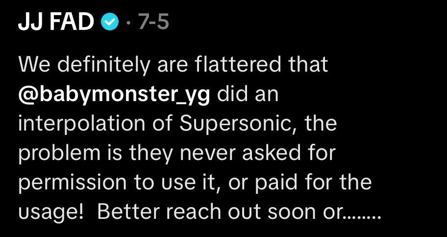 JJ FAD亦對此事件感到驚訝,並指BABYMONSTER從未通知她們,而事先獲得授權,也未支付任何版權費用。JJ FAD的回應引發音樂界對於版權和採樣(sampling)問題的再度關注,許多人開始討論在音樂創作中,如何平衡創新與尊重他人作品的界線。