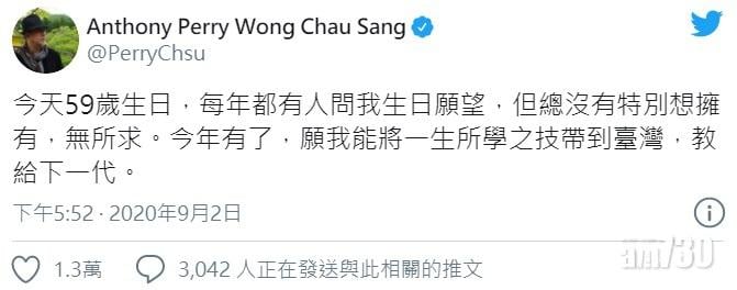 昨日(2日)是黃秋生的52歲生日,向來侍母至孝的他去了掃墓作為生日活動。其後秋生在Twitter打下生日願望,表示希望把一生所學猜到台灣,令不少台灣網民大為感動,有些更笑言叫秋生到當地開店賣叉燒包,他回覆表示正在計劃中,網民見到已留言表明會幫襯。