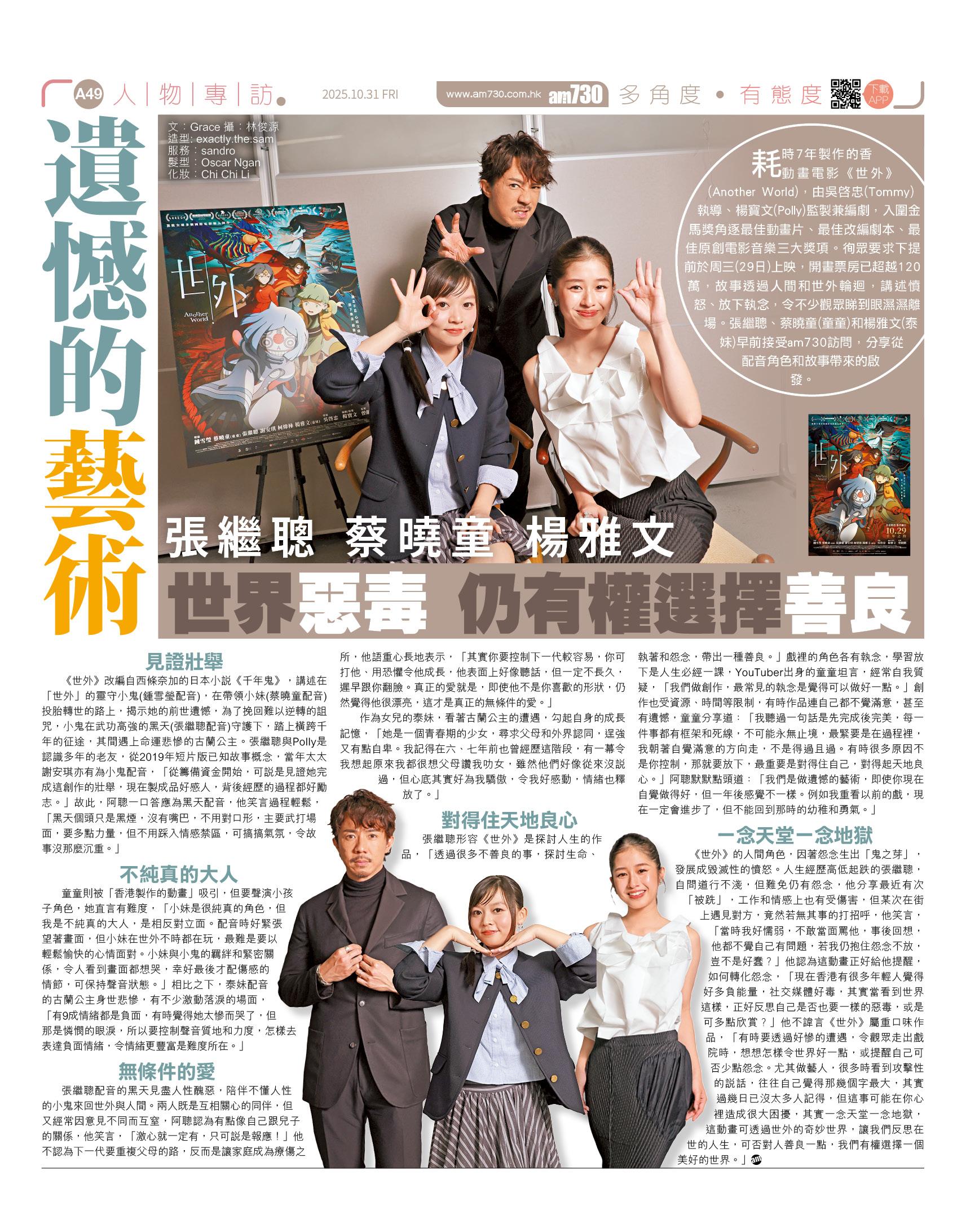 張繼聰、蔡曉童(童童)和楊雅文(泰妹)接受am730專訪,分享為香動畫電影《世外》配音的啟發。