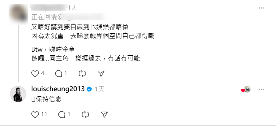 阿聰亦有留意他們的討論,並回應說︰「stay positive」、「人生總會遇到一啲難以想像嘅處境 最重要,係你用咩心態去面對 電影,工作,當然有影響 不過對比起我哋香港而家所面對嘅 實在微不足道我知道大家都唔好受 人生係會遇到好多挑戰 我哋肩並肩,手拖手,一齊行過去。最後,我從來都唔覺得自己黑仔。」