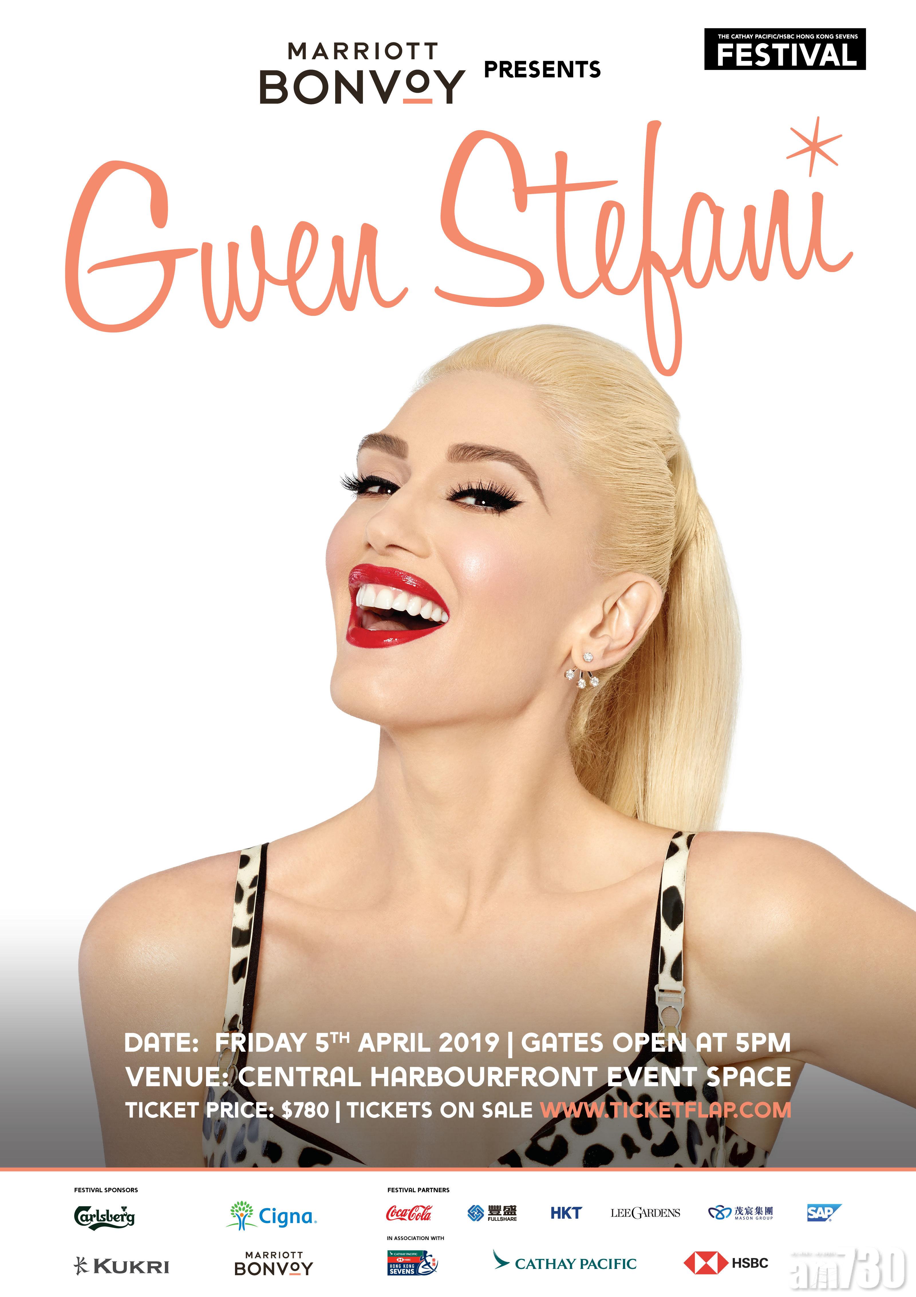 曾三次贏取格林美音樂獎項的女歌手Gwen Stefani,將於4月5日來港,於中環海濱活動空間舉行演唱會,音樂會是《國泰航空/匯豐香港國際七人欖球賽》欖球嘉年華一系列活動的壓軸表演,亦是Stefani事隔超過10年,再度重臨香港的演出。作為國際流行指標,Stefani先是pop punk樂隊No Doubt的主音,憑一曲《Don’t Speak》唱響國際,之後作獨立發展,獲得Pharrell Williams、André 3000、Nellee Hooper等點石成金的監製,以及英國樂隊New Order等,為其製作首張專輯《Love. Angel. Music. Baby》,將Gwen Stefani推上流行音樂女王的寶座,因為懷孕的關係,Gwen Stefani才放慢事業發展的步伐,Rihanna、Nicki Minaj才有機會上位。