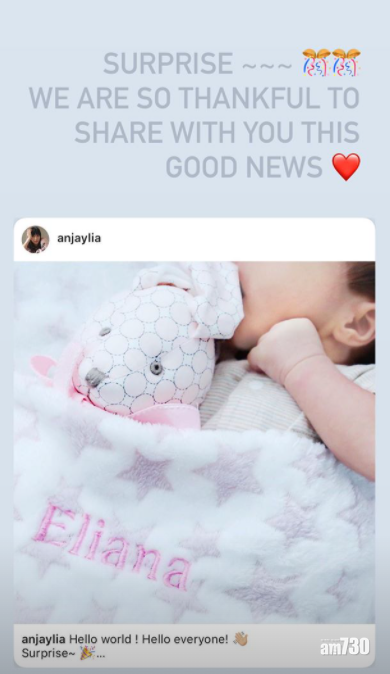 去年結婚的陳嘉寶(Anjaylia),與丈夫黃頌祈育有女兒Hosanna,升任做母親才一年的Anjaylia,今日在個人社交平台宣布驚喜消息,原來她秘密懷孕,並於日前誕下幼女Eliana。