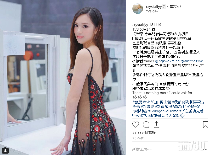 雖然盈盈的透視裙未必人人鍾意,但難得為台慶成功製造話題,絕對物有所值。其後她在IG上感激造型師與健身教練。她寫道︰「很榮幸 今年能參與司儀和表演項目,因此想以一個新鮮突破的造型來祝賀,也想挑戰自己,突破框框再出發。