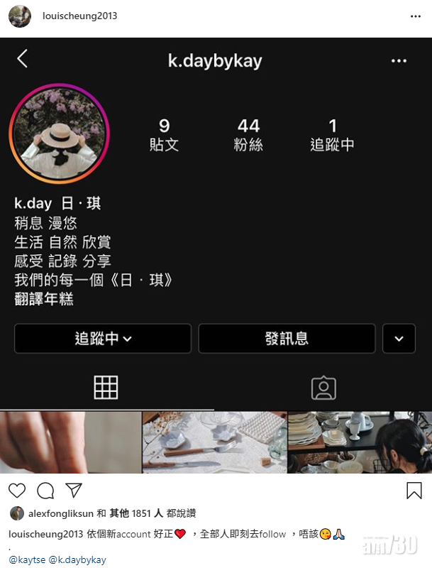Kay的新IG大走文青風格,跟原有的帳戶大大不同,新IG暫時有9則帖文,照片都以白色為主,首個PO見到她手持烹飪書,只露出一雙迷人眼睛,寫道︰「Welcome to the new journey.歡迎打開《日.琪》。另一個PO見到Kay在烘多士並寫道︰「調整生活步伐,為他製作一道簡單的素菜 ——在一個秋陽和煦的早上,烘一片多士,用香氣代替鬧鐘,輕輕喚醒睡夢中的他。溫柔地分享日光,不疾不徐地展開新的一天。」另一張照片就見到有人手執芝麻,她寫道︰「他的喜好,都是我最注重的細節。」相信Kay提及的「他」是指張繼聰。