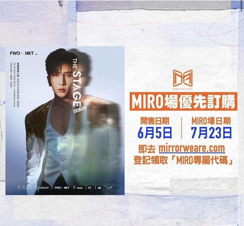 MIRROR成員盧瀚霆(Anson Lo)將於7月23至25日舉行個人演唱會《ANSON LO “THE STAGE” IN MY SIGHT SOLO CONCERT 2023》,而7月23日則為MIRO場。今日,MIRO 官方網公布會員優先購票詳情,由即日(26日)起至5月30日會員只需立即登入mirrorweare.com領取「MIRO專屬代碼」,在6月1日「MIRO專屬代碼」會發送到登記之電郵,並於6月5日透過早前於活動頁面登記之電郵獲取「指定網站連結」及「MIRO專屬代碼」,登入指定網站連結及輸入「MIRO專屬代碼」買飛,每個專屬代碼最多可以買2張飛,一眾神徒(粉絲暱稱)都非常期待。