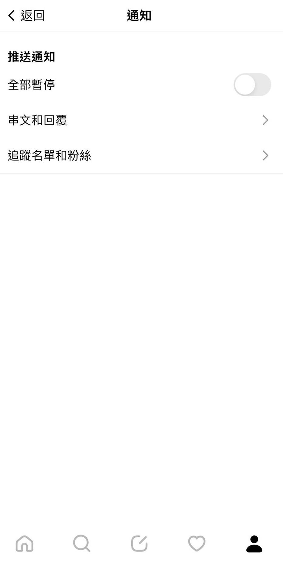 用戶只需點擊 Threads 個人檔案右上角的兩條線,然後選擇「通知」,即可自行調整有關接收串文、回覆、追蹤名單及追蹤者的通知,或暫停接收所有通知。