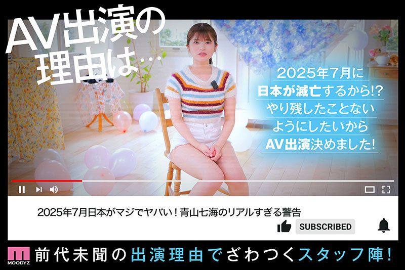 據青山七海表示,因為明年7月日本將會滅亡,所以她才出道拍攝AV,七海在鏡頭前認真地說:「日本2025年7月將會滅亡!」揚言要趁人類死光之前,做一些自己還沒做得的事,所以就決定加入AV界,片商也形容她是「做到世界末日的美少女」!