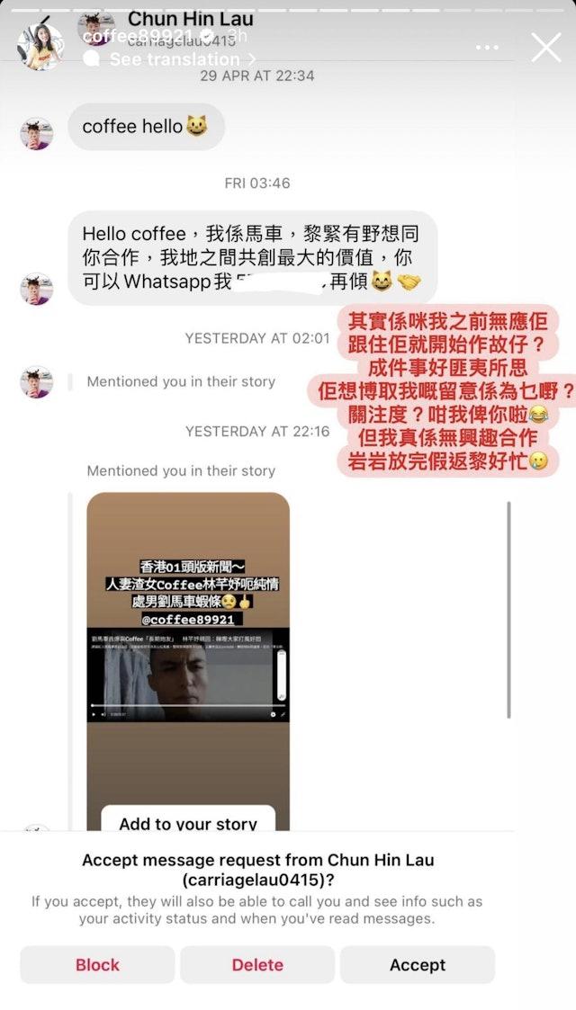 當時Coffee回應說︰「係咪真係有人會信?點解亂噏都可以咁多人有反應,睇嚟大家打風都好悶。不過睇完大家嘅留言我就安心啦,證明大家都係理性既。」今日Coffee上載IG對話截圖,見到劉馬車曾私訊她表示想合作,然而Coffee未有回答他。