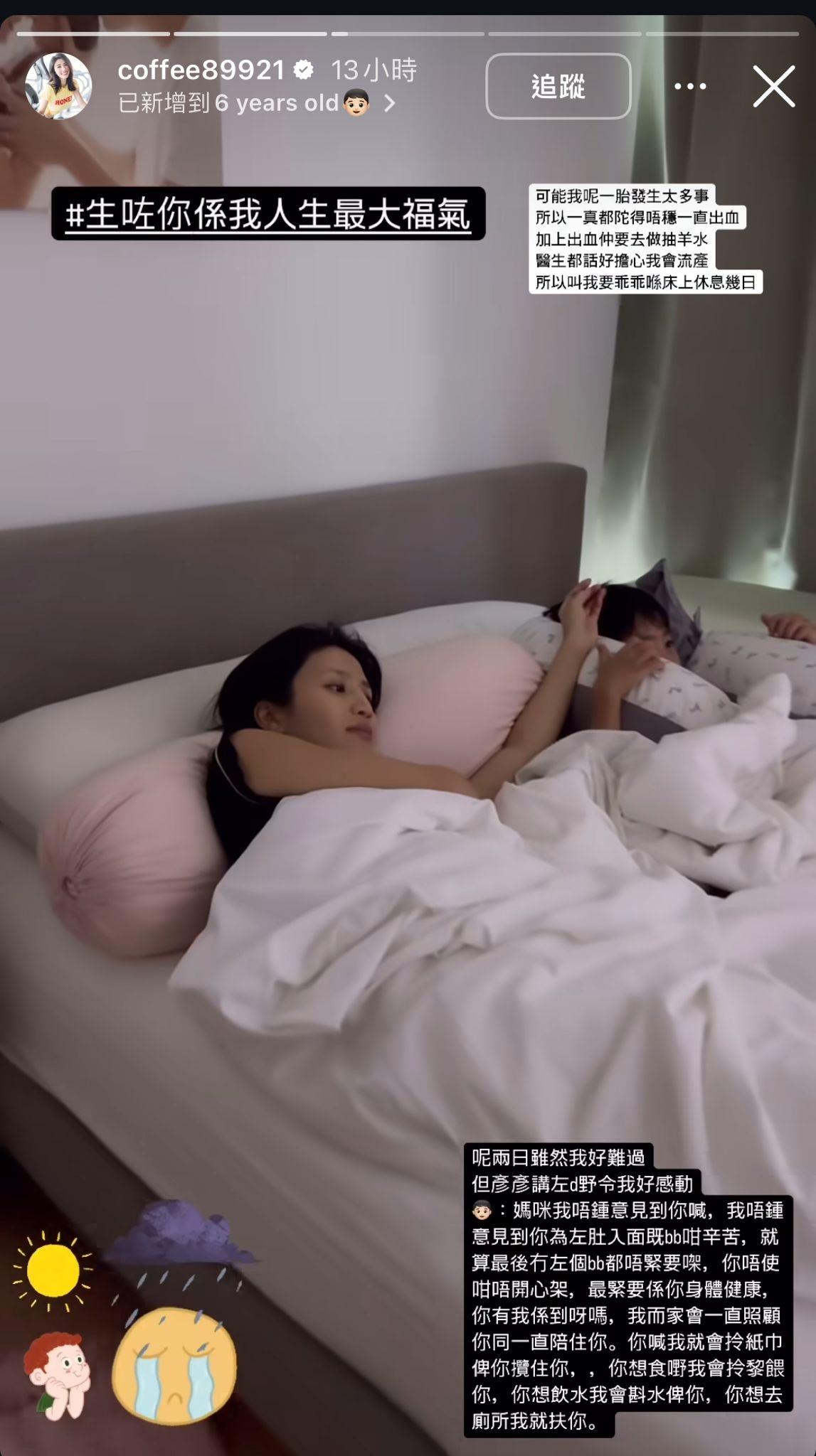 Coffee心情非常煎熬,她以黑底白字寫道︰「心情好忐忑,做咩都無心機,仲有幾多日我先知最終結果?其實等到依家都只係過咗一晚,如果判我死刑不如速戰速決,好辛苦、好難受。」她又上載跟囝囝在床上的影片,提到今胎發生太多事,所以一直都佗得不穩,一直都有出血情況,「醫生都話好擔心我會流產,所以叫我要乖乖喺床上休息幾日。」
