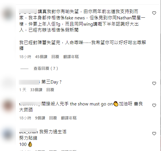 其後有網民列出時間線,質疑Day介入Nathan與圈外女友Jessie的關係。事件發酵多日,Day日前在TG粉絲群組回應︰「對不起讓喜歡我的大家擔心了,我會努力生活,專注工作,大家也要按時吃飯,繼續善良。」此外,她亦在IG貼上跟Gao及Candy的跳舞片段,當無事發生。