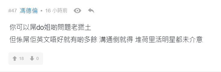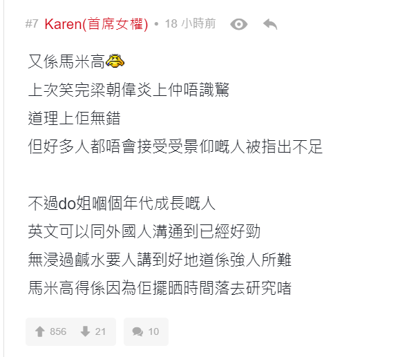 不過,也有人支持馬米高指出問題,令大家學到更多英文︰「唔係好關Do姐事。而係香港傳統英文教育就係咁」、「馬米高嘅重點應該係想講,Do姐嘅英文係可以應付到日常同外國人嘅普通交流,但如果要再深入啲,small talk嘅話,就未必應付到。」