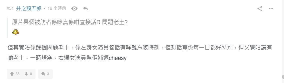 有網民指馬米高在「chessy」那場對話有誤解,「其實唔係踩個問題老土,係左邊女演員答話有咩難忘嘅時刻,佢想話真係每一日都好特別,但又覺咁講有啲老土,一時語塞,右邊女演員幫佢補返cheesy」。