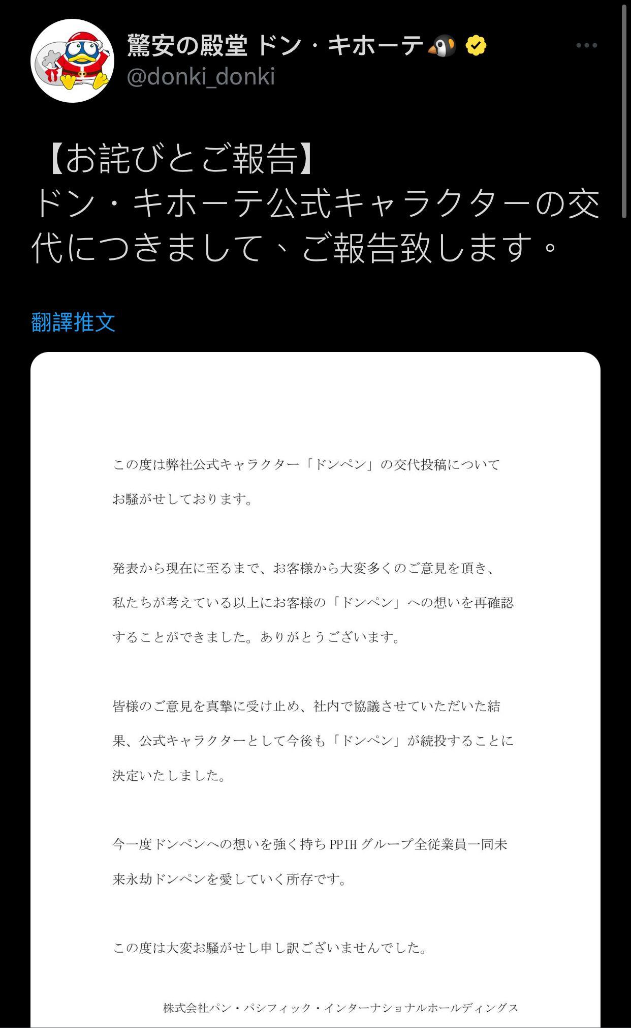 在一片批評聲音下,Donki於傍晚時份宣布跪低,Donki的官方Twitter帳戶發出道歉聲明,並對於廣大網民對一直為Donki宣傳的藍色企鵝「Donpen」如此愛戴,決定收回「Donpen」之退役決定,「Donpen」將繼續為公司擔任吉祥物。