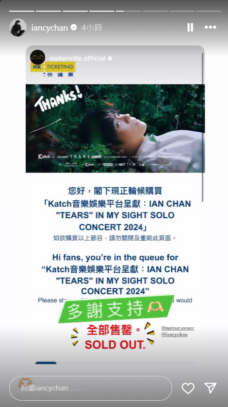 MIRROR成員陳卓賢(Ian)將於今年7月20至22日在亞博Arena舉行首次個人演唱會《IAN CHAN "TEARS" IN MY SIGHT SOLO CONCERT 2024》。門票今日公開發售,不少Hellosss為求入場支持Ian不惜用齊手機、電腦、平板電腦「load」完再「load」,惟三場門票火速售罄。有買不到飛的Hellosss留言要求加場,Ian亦轉載多個帖文多謝大家支持。