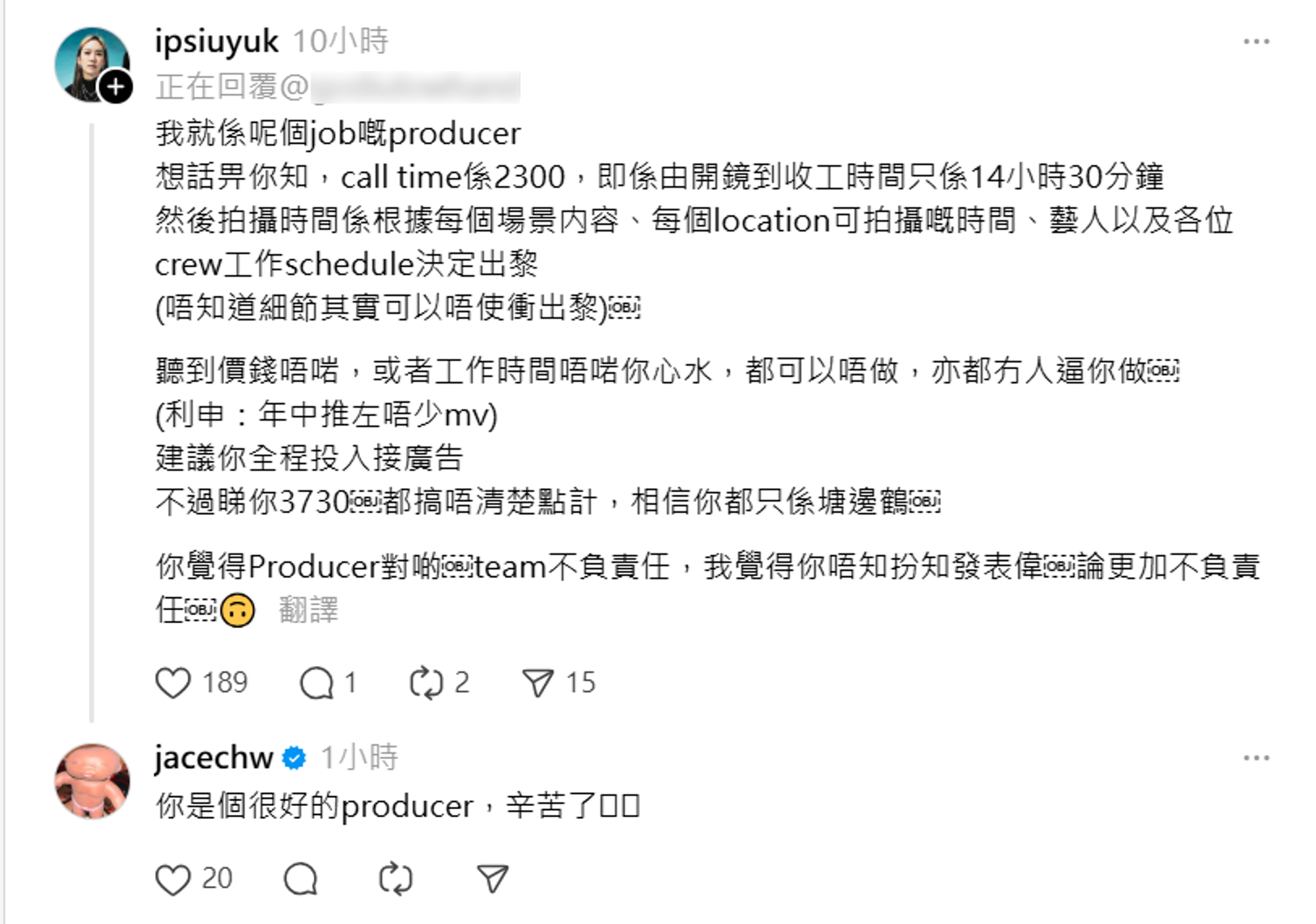 JACE則留言說︰「訓醒先睇threads,發現都係一場誤會,轉頭我都要再開十幾個鐘嘅拍攝嚕。其實衣行經常都連開十幾個鐘,都唔剩止係呢行嘅問題,係香港各行各業都遇到嘅工時問題,外國嘅拍攝會限咗最長工時,並確保crew喺開下一個製作之前有明確嘅休息時間,咁究竟香港production點樣可以有效拍攝?點樣令大家開工唔係淨係燃燒青春燃燒熱誠,而係更有系統地使整個行業更健康走得更遠?我相信多啲理性討論,一齊研究吓都係件好事!」