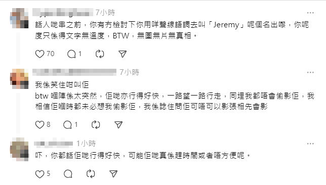 此帖亦引來ERROR的保錡留意,他寫道︰「佢好好人嫁喎!可能咁岩聽唔到!」其後有不少人在留言區貼上合照,力證Jeremy及Winka過去在街上都會應網民要求合照,並不像樓主所講一走了之。