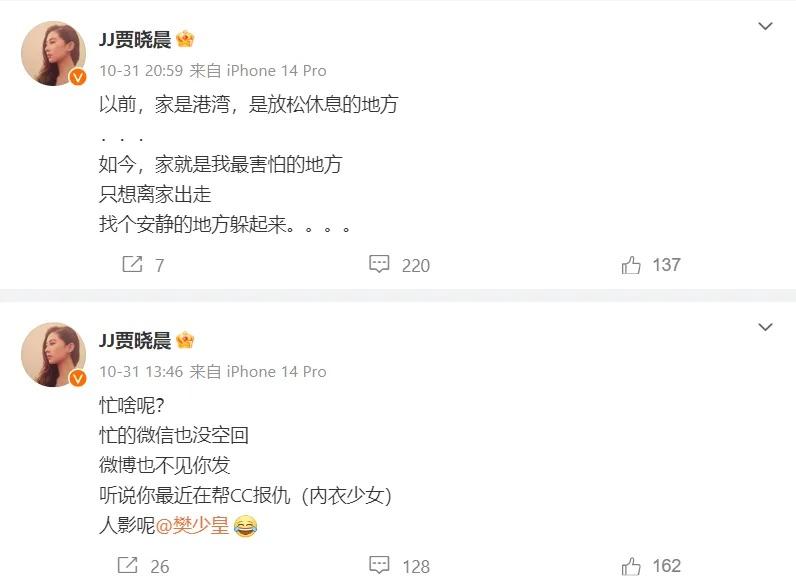賈曉晨先喺微博出PO轟樊少皇唔覆訊息:「忙啥呢?忙碌的微信也沒空回,微博也不見你發。聽說你最近在幫CC(JJ在《內衣少女》的角色)報仇,人影呢?」約數小時後她又再發文:「以前,家是港灣,是放鬆休息的地方...如今,家就是我最害怕的地方,只想離家出走,找個安靜的地方躲起來。。。。」