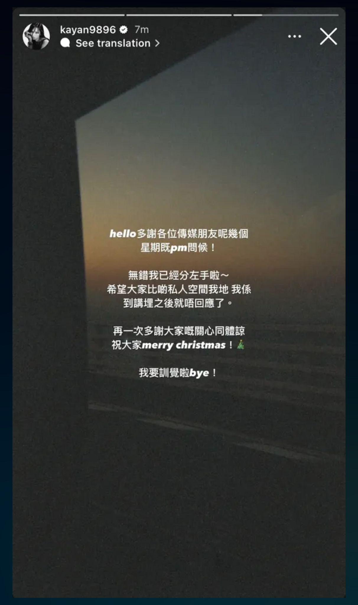 吳家忻(kayan9896)深夜宣布與薛芷倫囝囝馬桂烽分手。她在社交平台的限時動態寫道︰「hello多謝各位傳媒朋友呢幾個星期既pm問候!無錯我已經分左手啦~希望大家比啲私人空間我地 我係到講埋之後就唔回應了。再一次多謝大家嘅關心同體諒祝大家merry christmas !我要訓覺啦bye!」