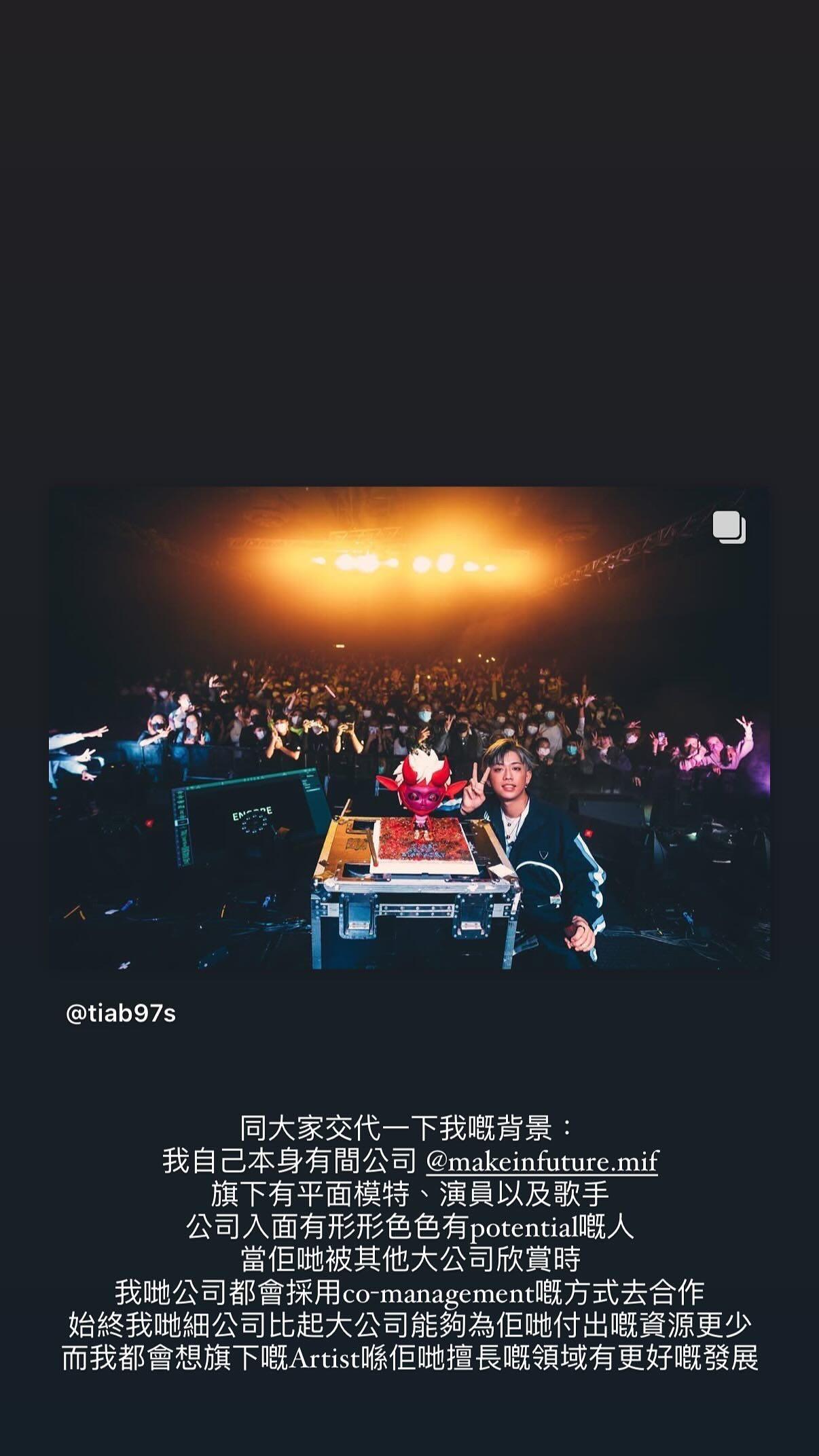 其後TIAB連出三個帖文回應事件,他先出PO先交代自己的背景,表示自己擁有一間經理人的公司,其後經kayan9896第一個經理人認識,自己覺得對方的聲線很好,於是決定跟對方簽約,讓她成為自己旗下音樂公司的歌手。「當其時佢份合約係co-management三方一齊簽,因為影視方面的而且確唔係我強項,咁理所當然就交返畀相關人士處理,而我就專注集中喺佢嘅音樂路上幫佢設計發展。」