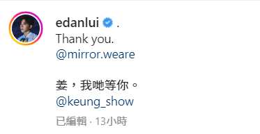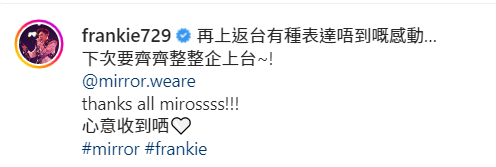 Lokman上載十一子的背影,留言說︰「大家好,我哋係Mirror!」AK留言說︰「多謝,等你回來姜濤,也謝謝你們等我們回來。」Edan(呂爵安)則表示:「Thank you. 姜,我哋等你。」Tiger(邱傲然) 謂:「好多好多混亂嘅思緒,但感謝大家,感謝所有嘢。」Jeremy(李駿傑):「今天這個舞台很珍貴,謝謝你們。」而Stanley(邱士縉)亦表示百感交集。