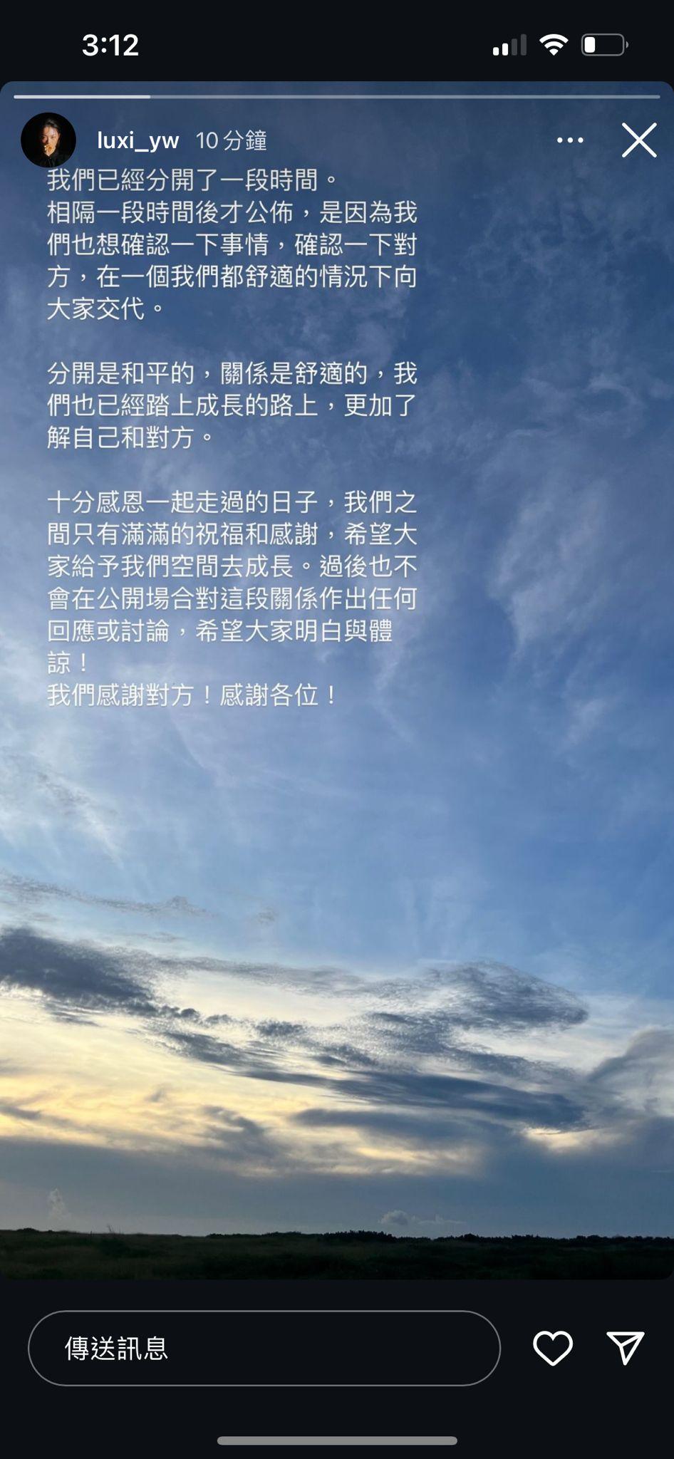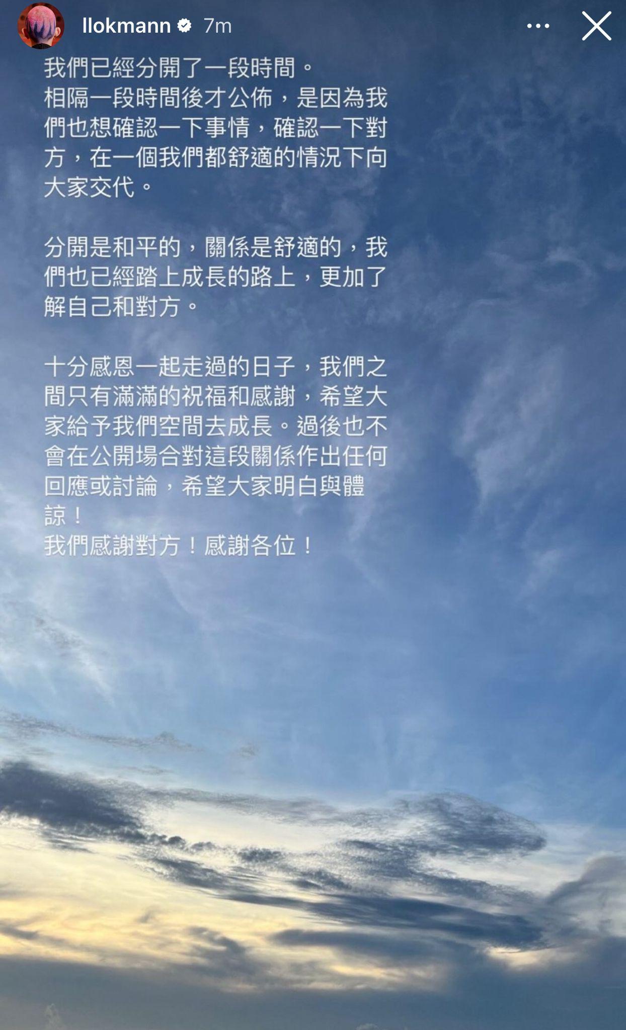 他們以同一張照片寫道︰「我們已經分開了一段時間。相隔一段時間後才公佈,是因為我們也想確認一下事情,確認一下對方,在一個我們都舒適的情況下向大家交代。分開是和平的,關係是舒適的,我們也已經踏上成長的路上,更加了解自己和對方。十分感恩一起走過的日子,我們之閰只有滿滿的祝福和感謝,希望大家給予我們空間去成長。過後也不會在公開場合對這段關係作出任何回應或討論,希望大家明白與體諒!我們感謝對方!感謝各位!」