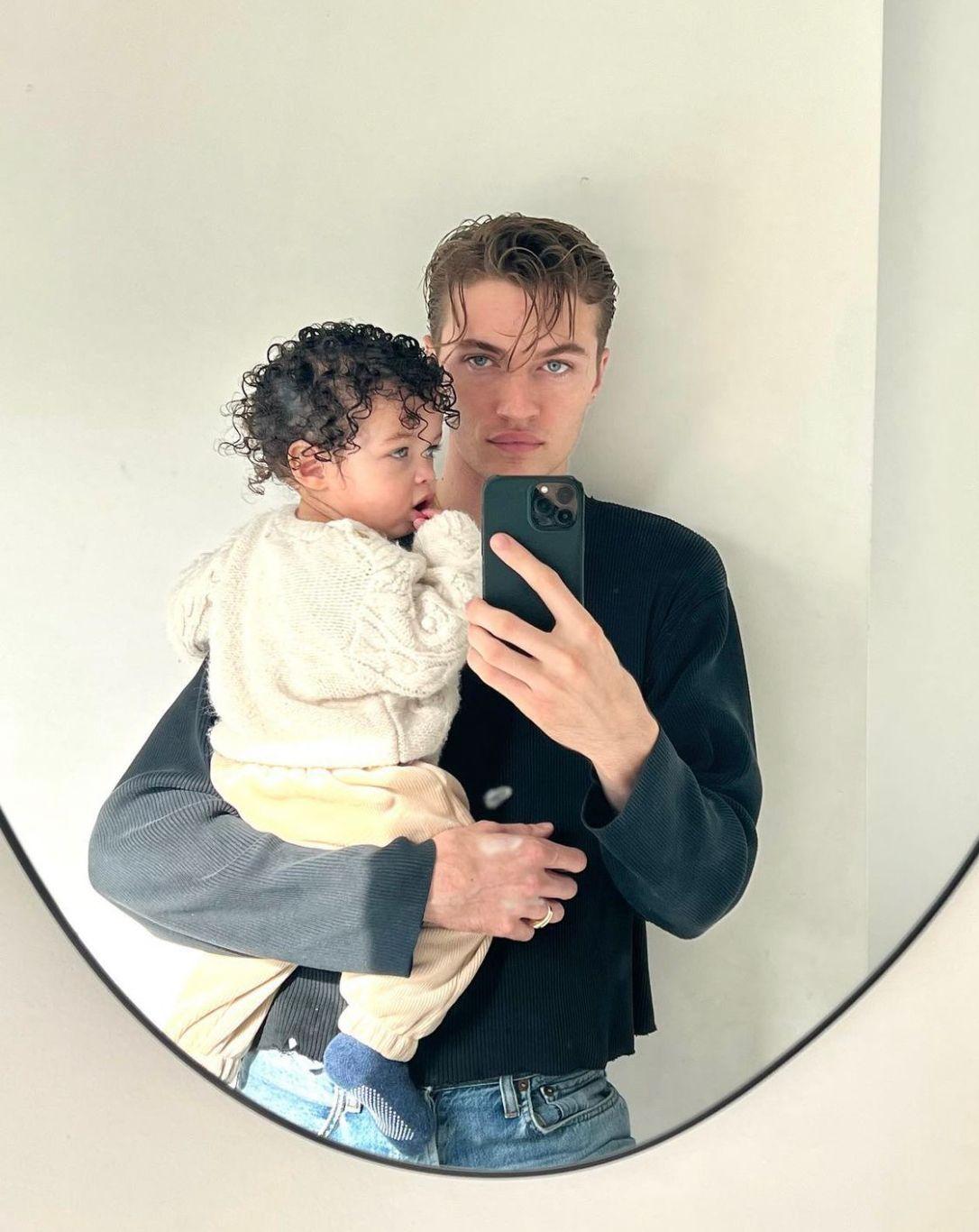 24歲模界男神Lucky Blue Smith,近日抱起1歲大囝囝自拍。