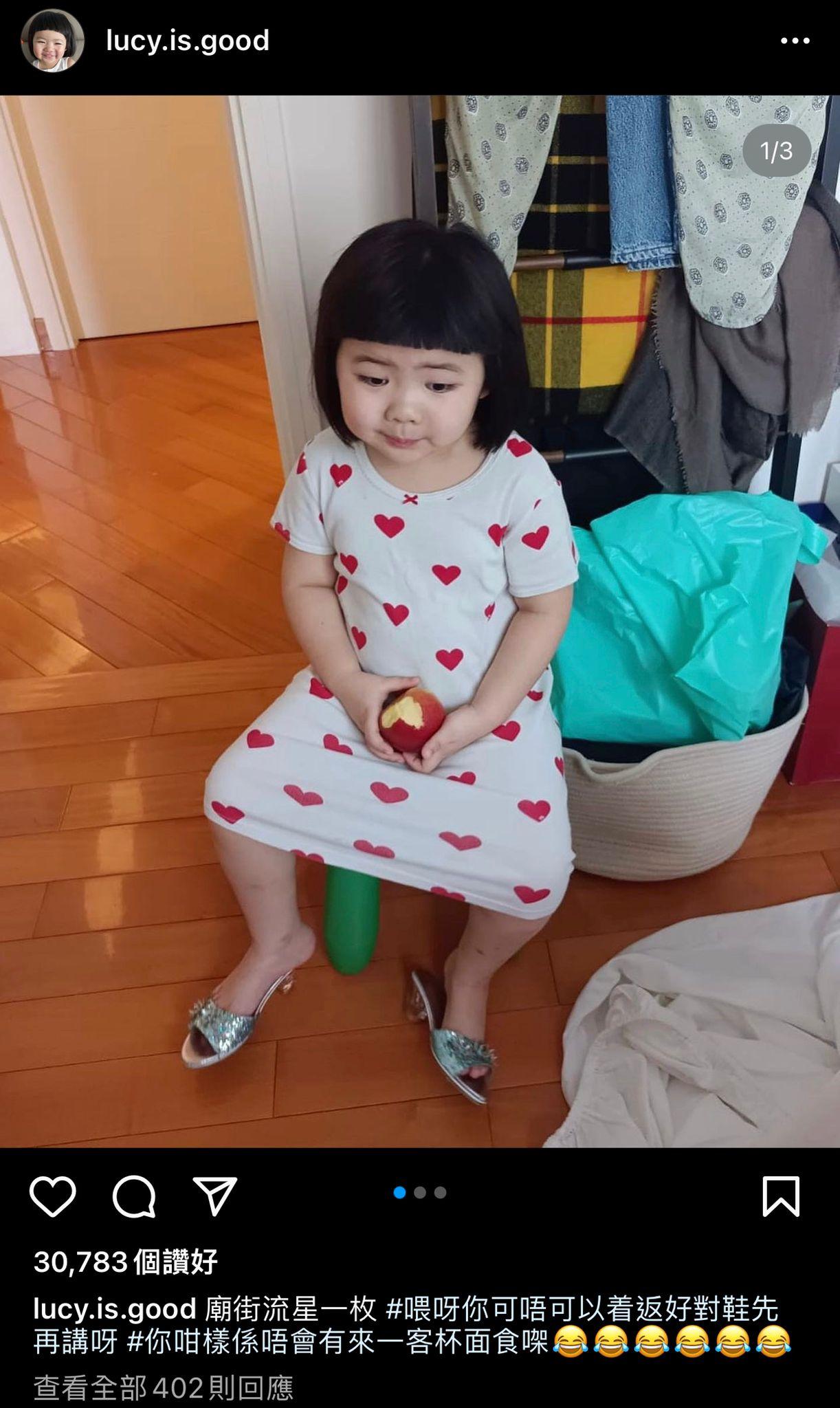 李璨琛的4歲女兒李元元(Lucy),獲星媽梁志瑩開IG帳戶,已有多逾38萬網民Followers,而Lucy不時分享生活日常,更會公開囡囡醜態及笑料,而日前Lucy被媽咪拍下在家中穿裙仔坐在椅上的照片,卻配合文字形容「廟街流鶯一枚 #喂呀你可唔可以着返好對鞋先再講呀 #你咁樣係唔會有客㗎」,結果此PO卻引來廣大網民極為反感,批評梁志瑩用詞不當,更不應把女兒形容為「廟街流鶯」。